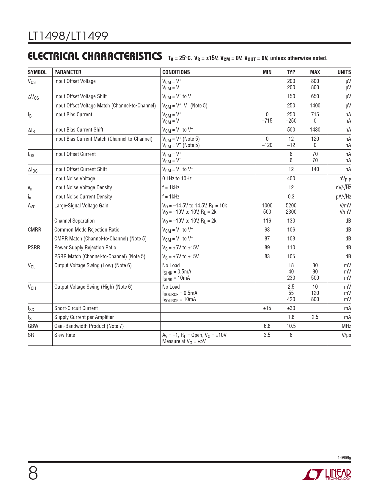 VOS Input Offset Voltage VCM = V+ 200 800 μV VCM = V– 200 800 μV ΔVOS Input Offset Voltage Shift VCM = V– to V+ 150 650 μV Input Offset Voltage Match (Channel-to-Channel) VCM = V+, V– (Note 5) 250 1400 μV IB Input Bias Current VCM = V+ 0 250 715 nA VCM = V– –715 –250 0 nA ΔIB Input Bias Current Shift VCM = V– to V+ 500 1430 nA Input Bias Current Match (Channel-to-Channel) VCM = V+ (Note 5) 0 12 120 nA VCM = V– (Note 5) –120 –12 0 nA IOS Input Offset Current VCM = V+ 6 70 nA VCM = V– 6 70 nA ΔIOS Input Offset Current Shift VCM = V– to V+ 12 140 nA Input Noise Voltage 0.1Hz to 10Hz 400 nVP-P en Input Noise Voltage Density f = 1kHz 12 nV/√Hz in Input Noise Current Density f = 1kHz 0.3 pA/√Hz AVOL Large-Signal Voltage Gain VO = –14.5V to 14.5V, RL = 10k 1000 5200 V/mV VO = –10V to 10V, RL = 2k 500 2300 V/mV Channel Separation VO = –10V to 10V, RL = 2k 116 130 dB CMRR Common Mode Rejection Ratio VCM = V– to V+ 93 106 dB CMRR Match (Channel-to-Channel) (Note 5) VCM = V– to V+ 87 103 dB PSRR Power Supply Rejection Ratio VS = ±5V to ±15V 89 110 dB PSRR Match (Channel-to-Channel) (Note 5) VS = ±5V to ±15V 83 105 dB VOL Output Voltage Swing (Low) (Note 6) No Load 18 30 mV ISINK = 0.5mA 40 80 mV ISINK = 10mA 230 500 mV VOH Output Voltage Swing (High) (Note 6) No Load 2.5 10 mV ISOURCE = 0.5mA 55 120 mV ISOURCE = 10mA 420 800 mV ISC Short-Circuit Current ±15 ±30 mA IS Supply Current per Amplifi er 1.8 2.5 mA GBW Gain-Bandwidth Product (Note 7) 6.8 10.5 MHz SR Slew Rate AV = –1, RL = Open, VO = ±10V 3.5 6 V/μs Measure at VO = ±5V 14989fg 8