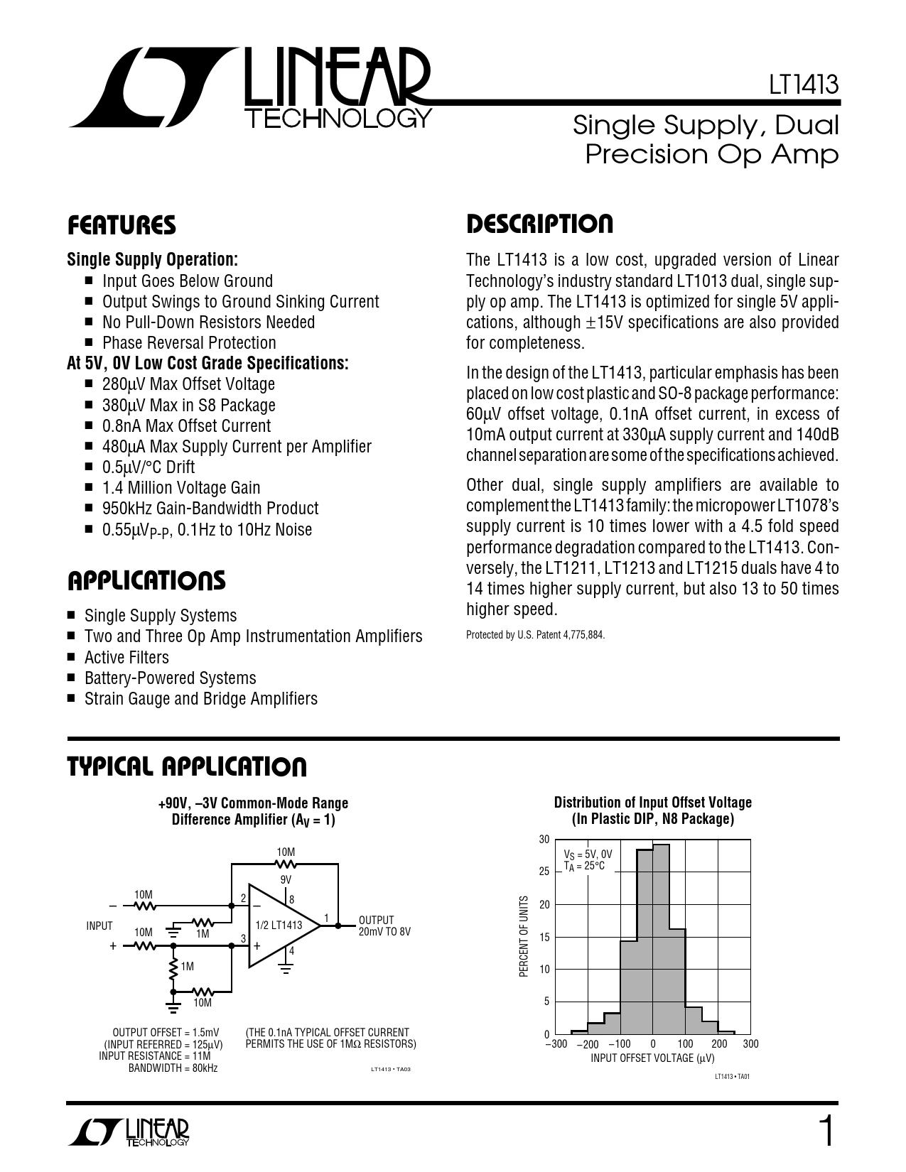 30 10M VS = 5V, 0V T 25 A = 25°C 9V 10M 2 8 20 – – 1 OUTPUT INPUT 1/2 LT1413 10M 1M 20mV TO 8V 3 15 + + 4 1M PERCENT OF UNITS 10 10M 5 1.5mV OUTPUT OFFSET = (THE 0.1nA TYPICAL OFFSET CURRENT 0 125 (INPUT REFERRED = µV) PERMITS THE USE OF 1MΩ RESISTORS) –300 –200 –100 0 100 200 300 11M INPUT RESISTANCE = INPUT OFFSET VOLTAGE (µV) 80kHz BANDWIDTH = LT1413 • TA03 LT1413 • TA01 1