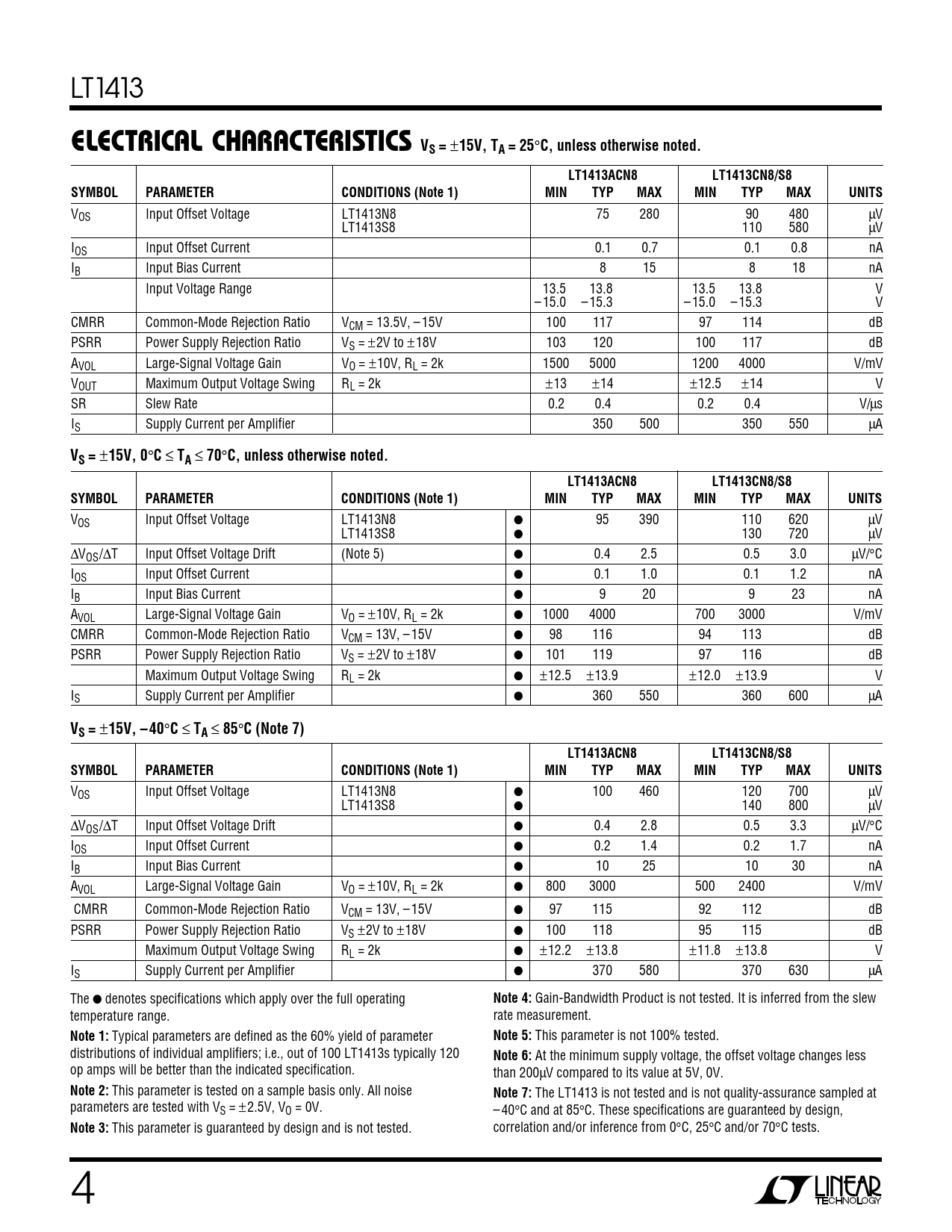 ELECTRICAL CHAR C. A TERISTICS VS =. 15V, TA = 25. C, unless otherwise noted. LT1413ACN8. LT1413CN8/S8. SYMBOL. PARAMETER