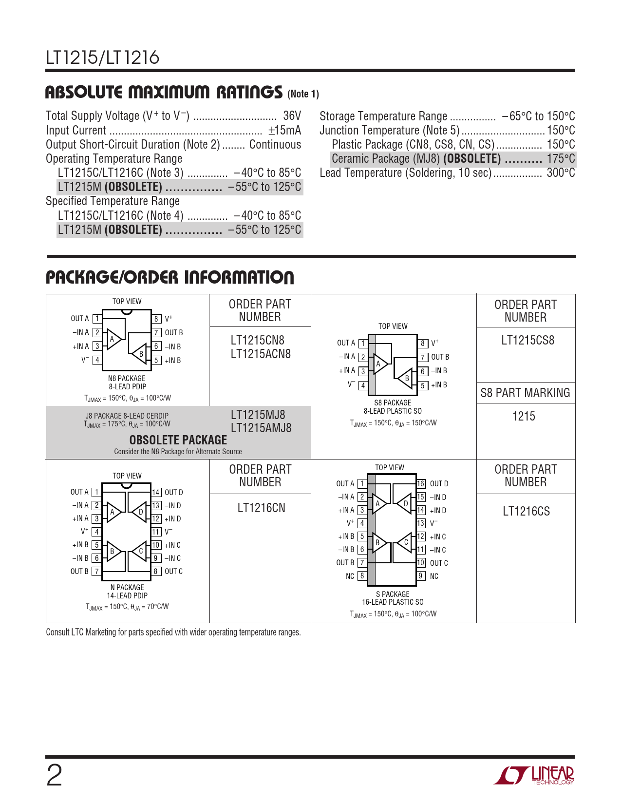 LT1215/LT1216 WWWUABSOLUTEAXI UAR TI GS (Note 1) Total Supply Voltage (V + to V –) ... 36V Storage Temperature Range .. – 65°C to 150°C Input Current ... ±15mA Junction Temperature (Note 5) ... 150°C Output Short-Circuit Duration (Note 2) .. Continuous Plastic Package (CN8, CS8, CN, CS).. 150°C Operating Temperature Range Ceramic Package (MJ8) (OBSOLETE) .. 175°C LT1215C/LT1216C (Note 3) .. – 40°C to 85°C Lead Temperature (Soldering, 10 sec)... 300°C LT1215M (OBSOLETE) ... – 55°C to 125°C Specified Temperature Range LT1215C/LT1216C (Note 4) .. – 40°C to 85°C LT1215M (OBSOLETE) ... – 55°C to 125°C UWUPACKAGE/ORDER I FOR ATIO TOP VIEW ORDER PART ORDER PART OUT A 1 8 V+ NUMBER NUMBER TOP VIEW –IN A 2 7 OUT B A LT1215CN8 OUT A 1 8 V+ LT1215CS8 +IN A 3 6 –IN B B LT1215ACN8 –IN A V– 4 OUT B 5 +IN B 2 7 A +IN A 3 6 –IN B N8 PACKAGE B 8-LEAD PDIP V– 4 5 +IN B S8 PART MARKING TJMAX = 150°C, θJA = 100°C/W S8 PACKAGE 8-LEAD PLASTIC SO J8 PACKAGE 8-LEAD CERDIP LT1215MJ8 1215 T T JMAX = 175°C, θJA = 100°C/W JMAX = 150°C, θJA = 150°C/W LT1215AMJ8 OBSOLETE PACKAGE Consider the N8 Package for Alternate Source ORDER PART TOP VIEW ORDER PART TOP VIEW NUMBER OUT A 1 16 OUT D NUMBER OUT A 1 14 OUT D –IN A 2 15 –IN D A D –IN A 2 13 –IN D LT1216CN +IN A 3 14 +IN D A D LT1216CS +IN A 3 12 +IN D V+ 4 13 V– V+ 4 11 V– +IN B 5 12 +IN C B C +IN B 5 10 +IN C B C –IN B 6 11 –IN C –IN B 6 9 –IN C OUT B 7 10 OUT C OUT B 7 8 OUT C NC 8 9 NC N PACKAGE S PACKAGE 14-LEAD PDIP 16-LEAD PLASTIC SO TJMAX = 150°C, θJA = 70°C/W TJMAX = 150°C, θJA = 100°C/W Consult LTC Marketing for parts specified with wider operating temperature ranges. 2