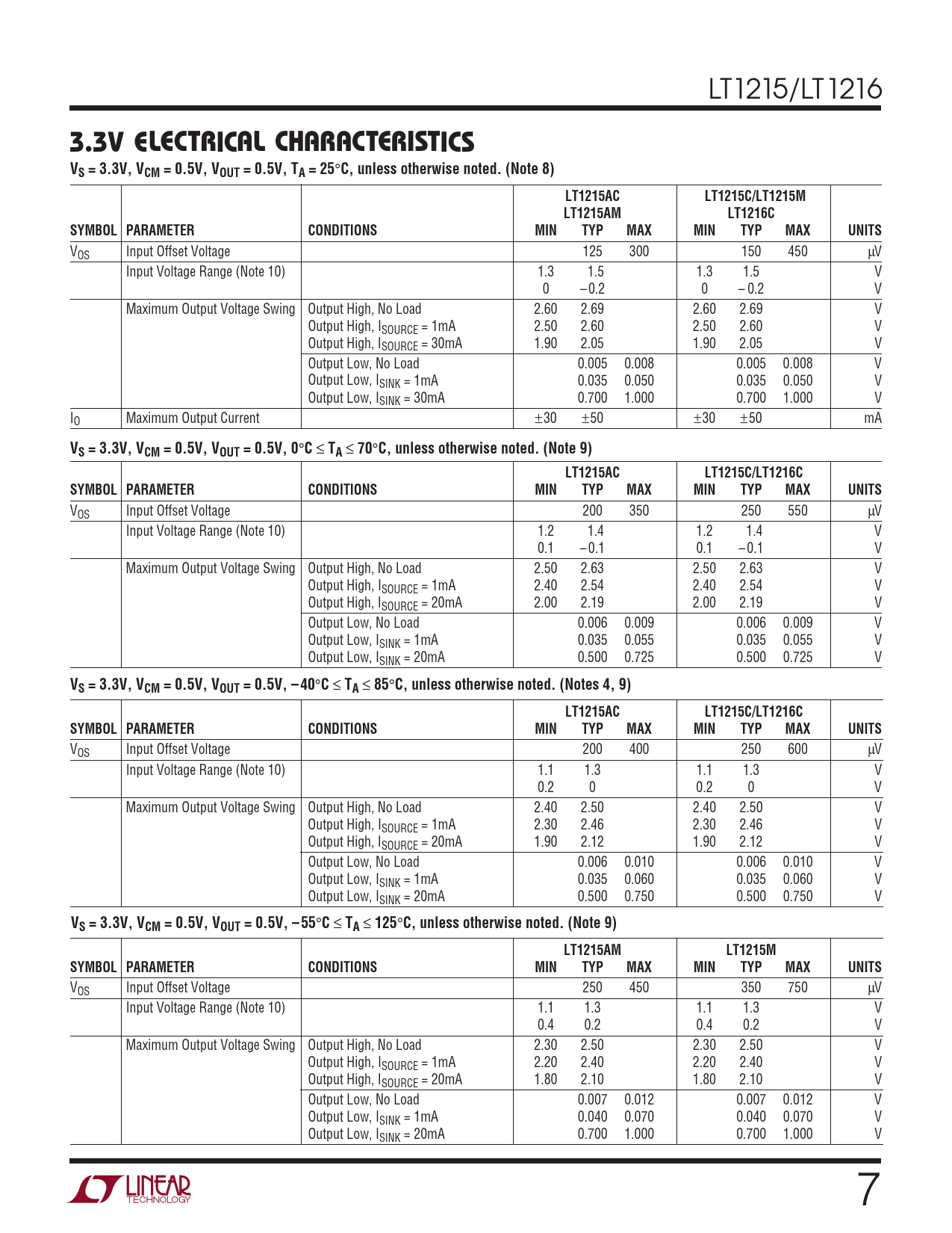 VOS Input Offset Voltage 250 450 350 750 µV Input Voltage Range (Note 10) 1.1 1.3 1.1 1.3 V 0.4 0.2 0.4 0.2 V Maximum Output Voltage Swing Output High, No Load 2.30 2.50 2.30 2.50 V Output High, ISOURCE = 1mA 2.20 2.40 2.20 2.40 V Output High, ISOURCE = 20mA 1.80 2.10 1.80 2.10 V Output Low, No Load 0.007 0.012 0.007 0.012 V Output Low, ISINK = 1mA 0.040 0.070 0.040 0.070 V Output Low, ISINK = 20mA 0.700 1.000 0.700 1.000 V 7