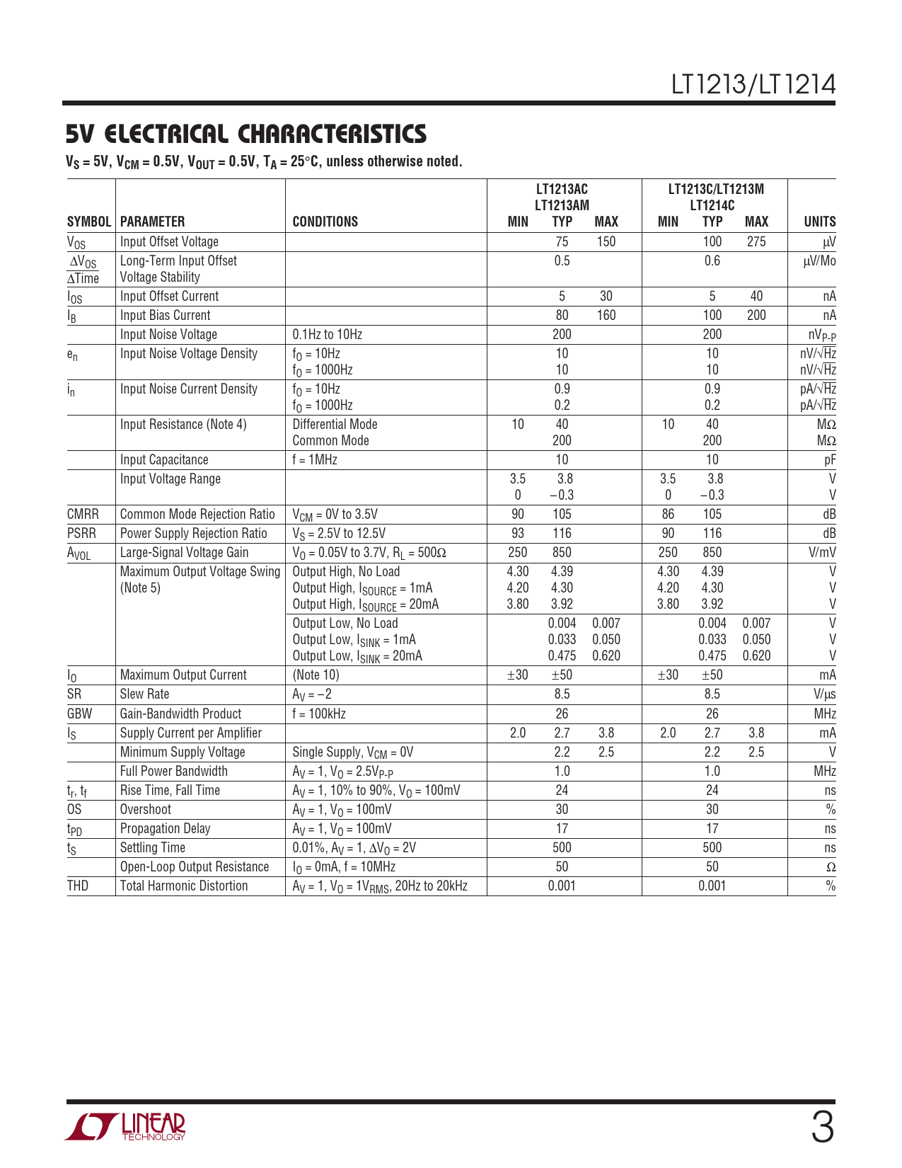 5V ELECTRICAL CH. ARA TERISTICS. VS = 5V, VCM = 0.5V, VOUT = 0.5V, TA = 25. C, unless otherwise noted. LT1213AC. LT1213C/LT1213M