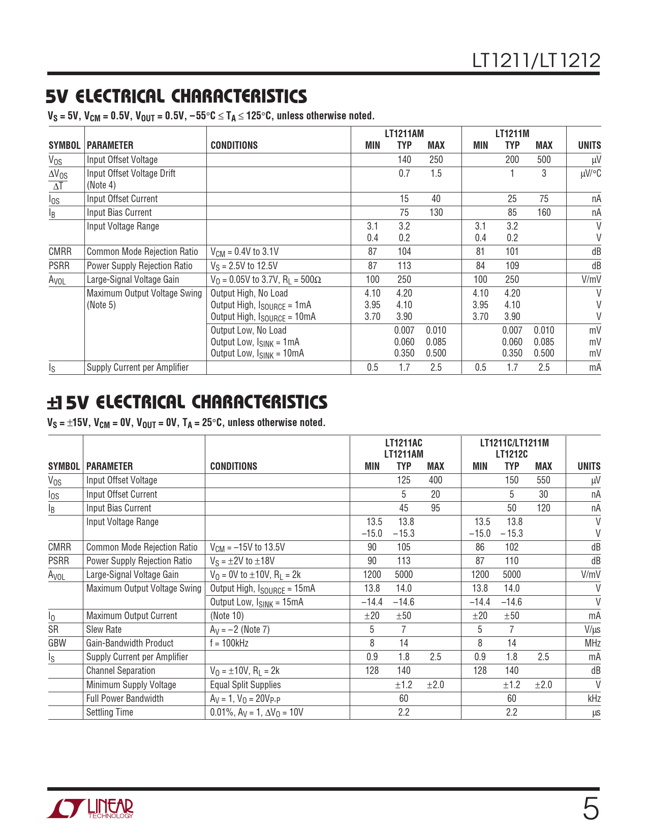 5V ELECTRICAL CH. ARA TERISTICS. VS = 5V, VCM = 0.5V, VOUT = 0.5V, – 55. 125. C, unless otherwise noted. LT1211AM. LT1211M