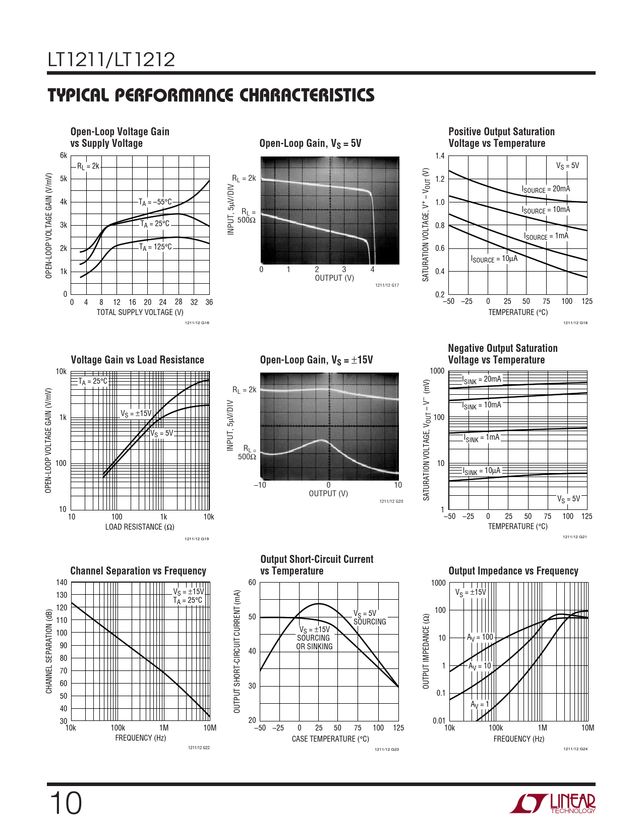 LT1211/LT1212 WUTYPICAL PERFOR A CE CHCARA TERISTICSOpen-Loop Voltage GainPositive Output Saturationvs Supply VoltageOpen-Loop Gain, VS = 5VVoltage vs Temperature 6k 1.4 R V L = 2k S = 5V (V) 5k RL = 2k 1.2 OUT ISOURCE = 20mA DIV – V 4k T + A = –55°C 1.0 µV/ I R SOURCE = 10mA L = 500Ω 3k TA = 25°C 0.8 INPUT, 5 ISOURCE = 1mA 2k TA = 125°C 0.6 ISOURCE = 10µA 0 1 2 3 4 1k 0.4 OPEN-LOOP VOLTAGE GAIN (V/mV) OUTPUT (V) SATURATION VOLTAGE, V 1211/12 G17 0 0.2 0 4 8 12 16 20 24 28 32 36 –50 –25 0 25 50 75 100 125 TOTAL SUPPLY VOLTAGE (V) TEMPERATURE (°C) 1211/12 G16 1211/12 G18 Negative Output SaturationVoltage Gain vs Load ResistanceOpen-Loop Gain, VS = ± 15VVoltage vs Temperature 10k 1000 I TA = 25°C SINK = 20mA RL = 2k (mV)– I DIV – V SINK = 10mA V 1k S = ±15V 100 µV/ OUT VS = 5V ISINK = 1mA INPUT, 5 RL = 500Ω 100 10 ISINK = 10µA –10 0 10 OPEN-LOOP VOLTAGE GAIN (V/mV) OUTPUT (V) SATURATION VOLTAGE, V V 1211/12 G20 S = 5V 10 1 10 100 1k 10k –50 –25 0 25 50 75 100 125 LOAD RESISTANCE (Ω) TEMPERATURE (°C) 1211/12 G21 1211/12 G19 Output Short-Circuit CurrentChannel Separation vs Frequencyvs TemperatureOutput Impedance vs Frequency 140 60 1000 VS = ±15V V 130 S = ±15V TA = 25°C 120 V ) 100 50 S = 5V 110 Ω SOURCING VS = ±15V 100 SOURCING 10 AV = 100 90 OR SINKING 40 80 1 AV = 10 70 60 30 OUTPUT IMPEDANCE ( CHANNEL SEPARATION (dB) 0.1 50 AV = 1 40 OUTPUT SHORT-CIRCUIT CURRENT (mA) 30 20 0.01 10k 100k 1M 10M –50 –25 0 25 50 75 100 125 10k 100k 1M 10M FREQUENCY (Hz) CASE TEMPERATURE (°C) FREQUENCY (Hz) 1211/12 G22 1211/12 G23 1211/12 G24 10