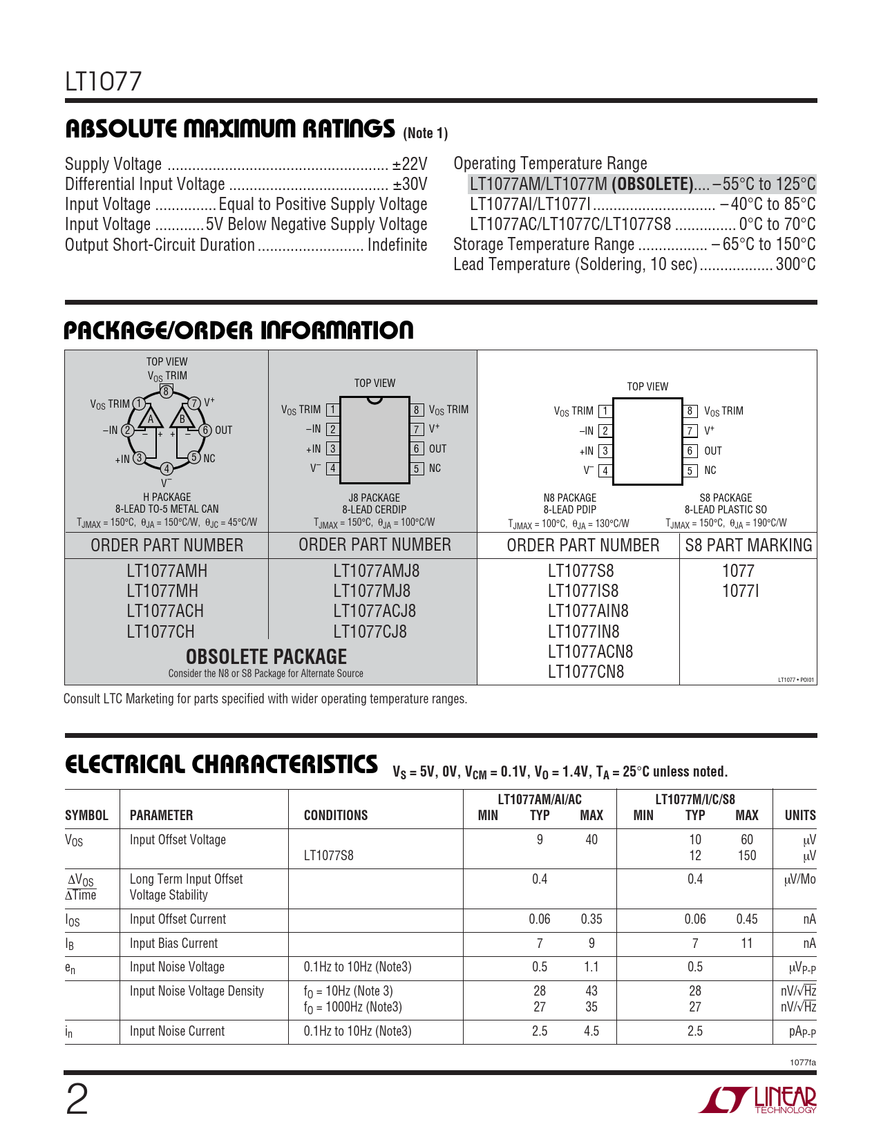 LT1077 WWWUABSOLUTE AXI U RATI GS (Note 1) Supply Voltage .. ±22V Operating Temperature Range Differential Input Voltage ... ±30V LT1077AM/LT1077M (OBSOLETE) .. – 55°C to 125°C Input Voltage ... Equal to Positive Supply Voltage LT1077AI/LT1077I .. – 40°C to 85°C Input Voltage .. 5V Below Negative Supply Voltage LT1077AC/LT1077C/LT1077S8 ... 0°C to 70°C Output Short-Circuit Duration .. Indefinite Storage Temperature Range ... – 65°C to 150°C Lead Temperature (Soldering, 10 sec).. 300°C UWUPACKAGE/ORDER I FOR ATIO TOP VIEW VOS TRIM TOP VIEW TOP VIEW 8 V 1 7 V+ OS TRIM V 1 OS TRIM 8 VOS TRIM V 1 8 V OS TRIM OS TRIM A B –IN 2 6 OUT – + + – –IN 2 7 V+ –IN 2 7 V+ +IN 3 6 OUT +IN 3 6 OUT +IN 3 5 NC 4 V– 4 5 NC V– 4 5 NC V– H PACKAGE J8 PACKAGE N8 PACKAGE S8 PACKAGE 8-LEAD TO-5 METAL CAN 8-LEAD CERDIP 8-LEAD PDIP 8-LEAD PLASTIC SO TJMAX = 150°C, θJA = 150°C/W, θJC = 45°C/W TJMAX = 150°C, θJA = 100°C/W TJMAX = 100°C, θJA = 130°C/W TJMAX = 150°C, θJA = 190°C/W ORDER PART NUMBER ORDER PART NUMBER ORDER PART NUMBER S8 PART MARKING LT1077AMH LT1077AMJ8 LT1077S8 1077 LT1077MH LT1077MJ8 LT1077IS8 1077I LT1077ACH LT1077ACJ8 LT1077AIN8 LT1077CH LT1077CJ8 LT1077IN8 LT1077ACN8 OBSOLETE PACKAGE Consider the N8 or S8 Package for Alternate Source LT1077CN8 LT1077 • POI01 Consult LTC Marketing for parts specified with wider operating temperature ranges. ELECTRICAL CHARACTERISTICS VS = 5V, 0V, VCM = 0.1V, VO = 1.4V, TA = 25 ° C unless noted.LT1077AM/AI/ACLT1077M/I/C/S8SYMBOLPARAMETERCONDITIONSMINTYPMAXMINTYPMAXUNITS VOS Input Offset Voltage 9 40 10 60 µV LT1077S8 12 150 µV ∆VOS Long Term Input Offset 0.4 0.4 µV/Mo ∆Time Voltage Stability IOS Input Offset Current 0.06 0.35 0.06 0.45 nA IB Input Bias Current 7 9 7 11 nA en Input Noise Voltage 0.1Hz to 10Hz (Note3) 0.5 1.1 0.5 µVP-P Input Noise Voltage Density fO = 10Hz (Note 3) 28 43 28 nV/√Hz fO = 1000Hz (Note3) 27 35 27 nV/√Hz in Input Noise Current 0.1Hz to 10Hz (Note3) 2.5 4.5 2.5 pAP-P 1077fa 2