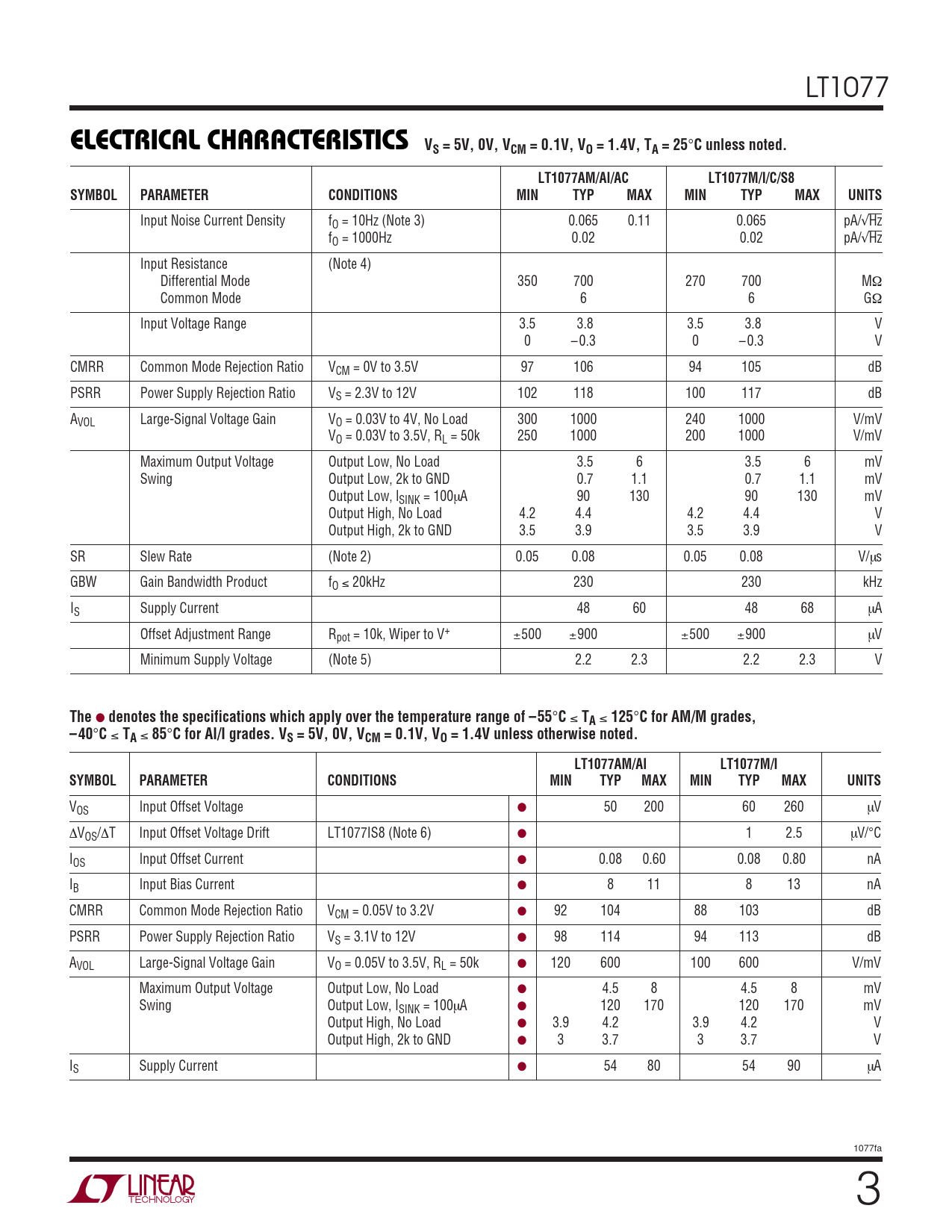 LT1077 ELECTRICAL CHARACTERISTICS VS = 5V, 0V, VCM = 0.1V, VO = 1.4V, TA = 25 ° C unless noted.LT1077AM/AI/ACLT1077M/I/C/S8SYMBOLPARAMETERCONDITIONSMINTYPMAXMINTYPMAXUNITS Input Noise Current Density fO = 10Hz (Note 3) 0.065 0.11 0.065 pA/√Hz fO = 1000Hz 0.02 0.02 pA/√Hz Input Resistance (Note 4) Differential Mode 350 700 270 700 MΩ Common Mode 6 6 GΩ Input Voltage Range 3.5 3.8 3.5 3.8 V 0 – 0.3 0 – 0.3 V CMRR Common Mode Rejection Ratio VCM = 0V to 3.5V 97 106 94 105 dB PSRR Power Supply Rejection Ratio VS = 2.3V to 12V 102 118 100 117 dB AVOL Large-Signal Voltage Gain VO = 0.03V to 4V, No Load 300 1000 240 1000 V/mV VO = 0.03V to 3.5V, RL = 50k 250 1000 200 1000 V/mV Maximum Output Voltage Output Low, No Load 3.5 6 3.5 6 mV Swing Output Low, 2k to GND 0.7 1.1 0.7 1.1 mV Output Low, lSINK = 100µA 90 130 90 130 mV Output High, No Load 4.2 4.4 4.2 4.4 V Output High, 2k to GND 3.5 3.9 3.5 3.9 V SR Slew Rate (Note 2) 0.05 0.08 0.05 0.08 V/µs GBW Gain Bandwidth Product fO ≤ 20kHz 230 230 kHz IS Supply Current 48 60 48 68 µA Offset Adjustment Range Rpot = 10k, Wiper to V+ ±500 ±900 ±500 ±900 µV Minimum Supply Voltage (Note 5) 2.2 2.3 2.2 2.3 V The ● denotes the specifications which apply over the temperature range of –55 ° C ≤ TA ≤ 125 ° C for AM/M grades,–40 ° C ≤ TA ≤ 85 ° C for AI/I grades. VS = 5V, 0V, VCM = 0.1V, VO = 1.4V unless otherwise noted.LT1077AM/AILT1077M/ISYMBOLPARAMETERCONDITIONSMINTYPMAXMINTYPMAXUNITS VOS Input Offset Voltage ● 50 200 60 260 µV ∆VOS/∆T Input Offset Voltage Drift LT1077IS8 (Note 6) ● 1 2.5 µV/°C IOS Input Offset Current ● 0.08 0.60 0.08 0.80 nA IB Input Bias Current ● 8 11 8 13 nA CMRR Common Mode Rejection Ratio VCM = 0.05V to 3.2V ● 92 104 88 103 dB PSRR Power Supply Rejection Ratio VS = 3.1V to 12V ● 98 114 94 113 dB AVOL Large-Signal Voltage Gain VO = 0.05V to 3.5V, RL = 50k ● 120 600 100 600 V/mV Maximum Output Voltage Output Low, No Load ● 4.5 8 4.5 8 mV Swing Output Low, ISINK = 100µA ● 120 170 120 170 mV Output High, No Load ● 3.9 4.2 3.9 4.2 V Output High, 2k to GND ● 3 3.7 3 3.7 V IS Supply Current ● 54 80 54 90 µA 1077fa 3
