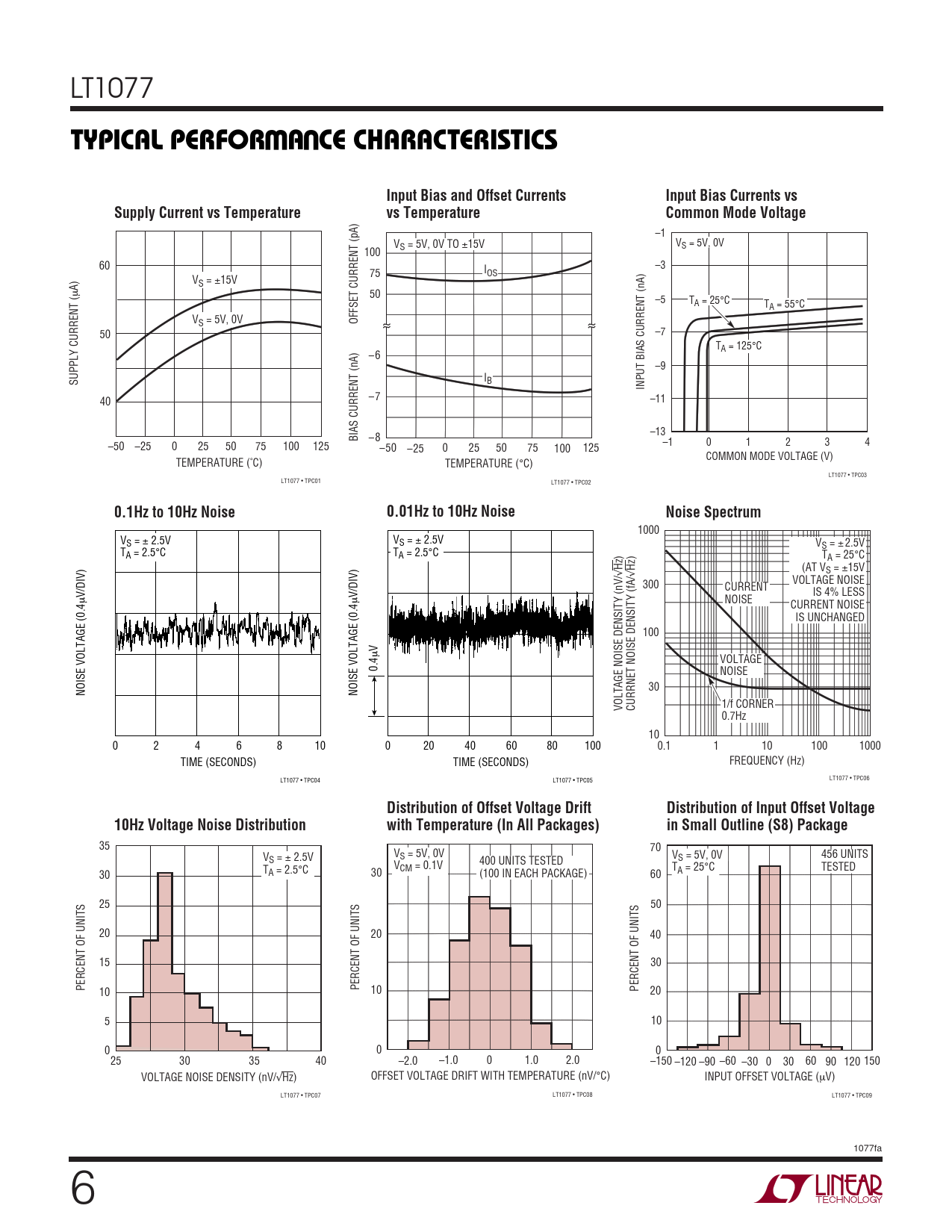 LT1077 WUTYPICAL PERFOR A CE CHARACTERISTICSInput Bias and Offset CurrentsInput Bias Currents vsSupply Current vs Temperaturevs TemperatureCommon Mode Voltage –1 V V S = 5V, 0V TO ±15V S = 5V, 0V 100 60 –3 75 IOS V A) S = ±15V µ 50 –5 TA = 25°C TA = 55°C VS = 5V, 0V OFFSET CURRENT (pA) 50 –7 TA = 125°C –6 –9 SUPPLY CURRENT ( IB INPUT BIAS CURRENT (nA) –7 40 –11 –13 BIAS CURRENT (nA) –8 –50 –25 0 25 50 75 100 125 –1 0 1 2 3 4 –50 –25 0 25 50 75 100 125 COMMON MODE VOLTAGE (V) TEMPERATURE (˚C) TEMPERATURE (°C) LT1077 • TPC03 LT1077 • TPC01 LT1077 • TPC02 0.1Hz to 10Hz Noise0.01Hz to 10Hz NoiseNoise Spectrum 1000 VS = ± 2.5V VS = ± 2.5V VS = ± 2.5V TA = 2.5°C TA = 2.5°C TA = 25°C Hz) Hz) (AT V √ √ S = ±15V 300 VOLTAGE NOISE CURRENT V/DIV) V/DIV) IS 4% LESS µ µ NOISE CURRENT NOISE IS UNCHANGED 100 V µ VOLTAGE 0.4 NOISE 30 NOISE VOLTAGE (0.4 NOISE VOLTAGE (0.4 VOLTAGE NOISE DENSITY (nV/ CURRNET NOISE DENSITY (fA/ 1/f CORNER 0.7Hz 10 0 2 4 6 8 10 0 20 40 60 80 100 0.1 1 10 100 1000 TIME (SECONDS) TIME (SECONDS) FREQUENCY (Hz) LT1077 • TPC04 LT1077 • TPC05 LT1077 • TPC06 Distribution of Offset Voltage DriftDistribution of Input Offset Voltage10Hz Voltage Noise Distributionwith Temperature (In All Packages)in Small Outline (S8) Package 35 70 V V V 456 UNITS S = ± 2.5V S = 5V, 0V S = 5V, 0V T VCM = 0.1V 400 UNITS TESTED T TESTED 30 A = 2.5°C 30 (100 IN EACH PACKAGE) 60 A = 25°C 25 50 20 20 40 15 30 PERCENT OF UNITS PERCENT OF UNITS 10 10 PERCENT OF UNITS 20 5 10 0 0 0 25 30 35 40 –2.0 –1.0 0 1.0 2.0 –150 –120 –90 –60 –30 0 30 60 90 120 150 VOLTAGE NOISE DENSITY (nV/√Hz) OFFSET VOLTAGE DRIFT WITH TEMPERATURE (nV/°C) INPUT OFFSET VOLTAGE (µV) LT1077 • TPC07 LT1077 • TPC08 LT1077 • TPC09 1077fa 6