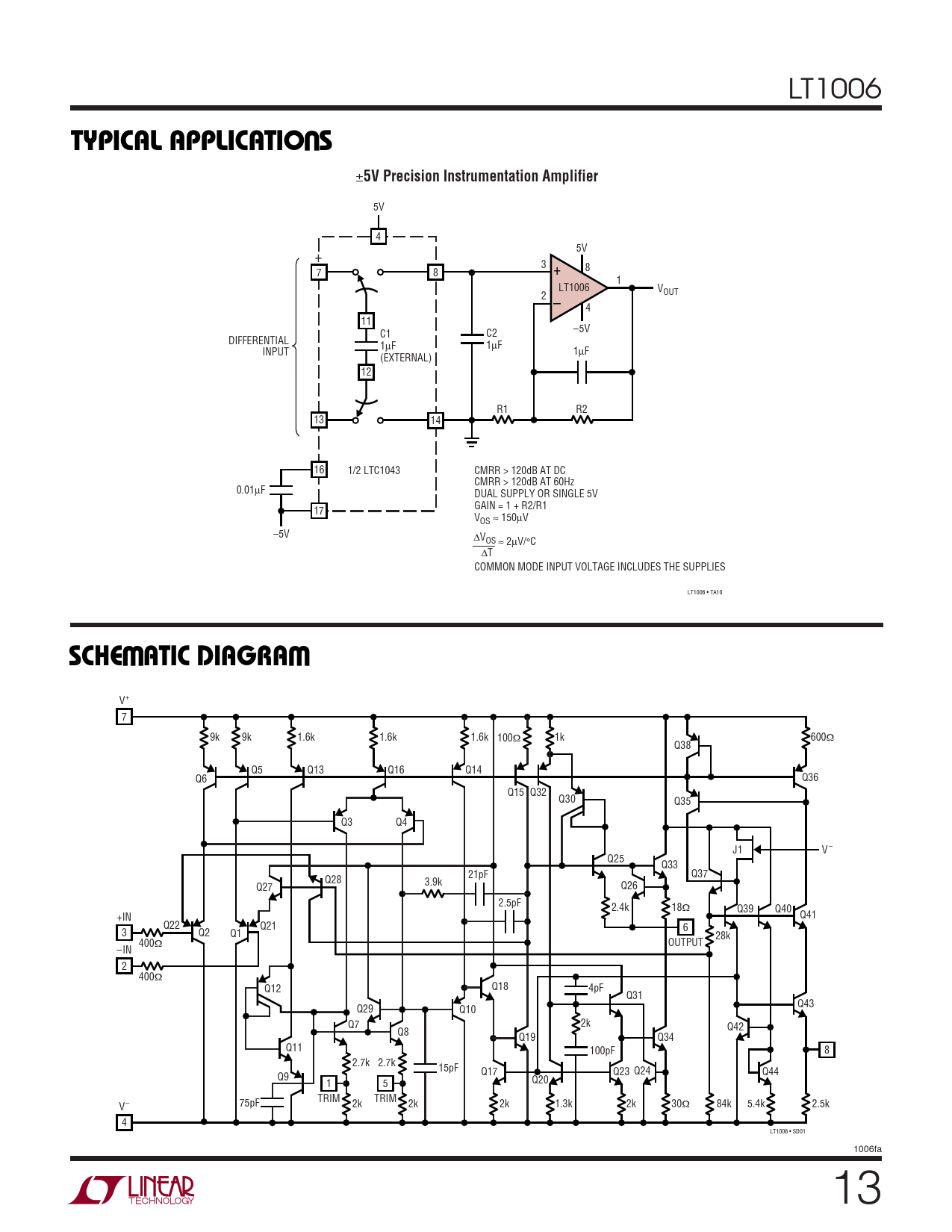 5V 4 5V + 3 8 7 8 + 1 LT1006 V 2 OUT – 4 11 –5V C1 C2 DIFFERENTIAL 1µF 1µF INPUT 1µF (EXTERNAL) 12 R1 R2 13 14 16 1/2 LTC1043 CMRR > 120dB AT DC CMRR > 120dB AT 60Hz 0.01µF DUAL SUPPLY OR SINGLE 5V GAIN = 1 + R2/R1 17 VOS ≈ 150µV –5V ∆VOS ≈ 2µV/°C ∆T COMMON MODE INPUT VOLTAGE INCLUDES THE SUPPLIES LT1006 • TA10