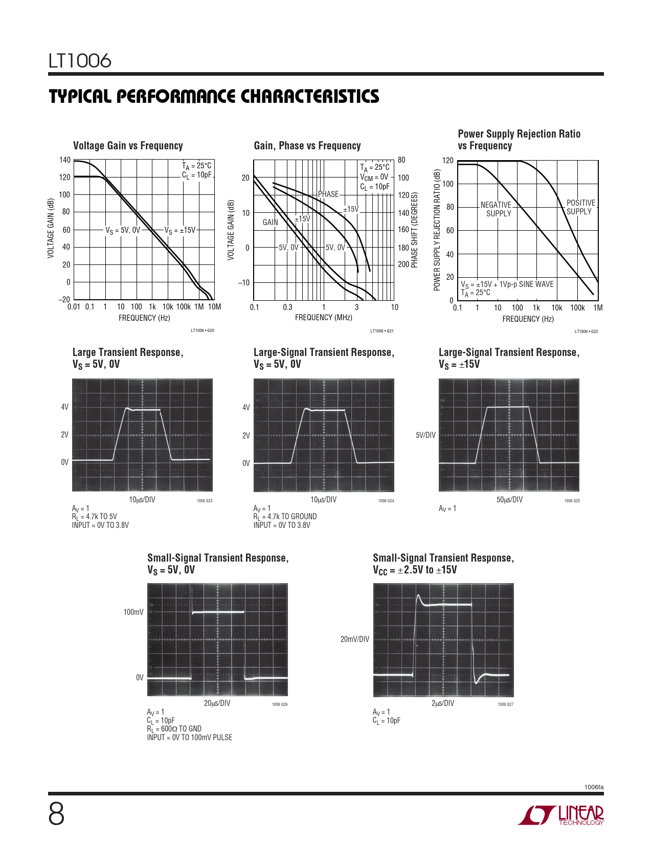 100mV 20mV/DIV 0V 20µs/DIV 1006 G26 2µs/DIV 1006 G27 AV = 1 AV = 1 CL = 10pF CL = 10pF RL = 600Ω TO GND INPUT = 0V TO 100mV PULSE 1006fa 8