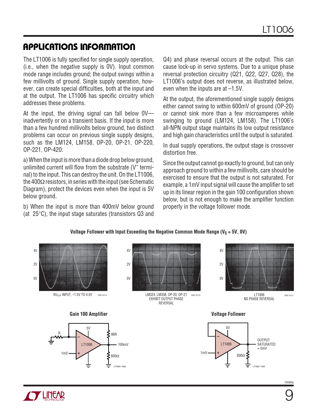 4V 4V 4V 2V 2V 2V 0V 0V 0V 6VP-P INPUT, –1.5V TO 4.5V 1006 TA11a LM324, LM358, OP-20, OP-21 1006 TA11b LT1006 1006 TA11c EXHIBIT OUTPUT PHASE NO PHASE REVERSAL REVERSAL