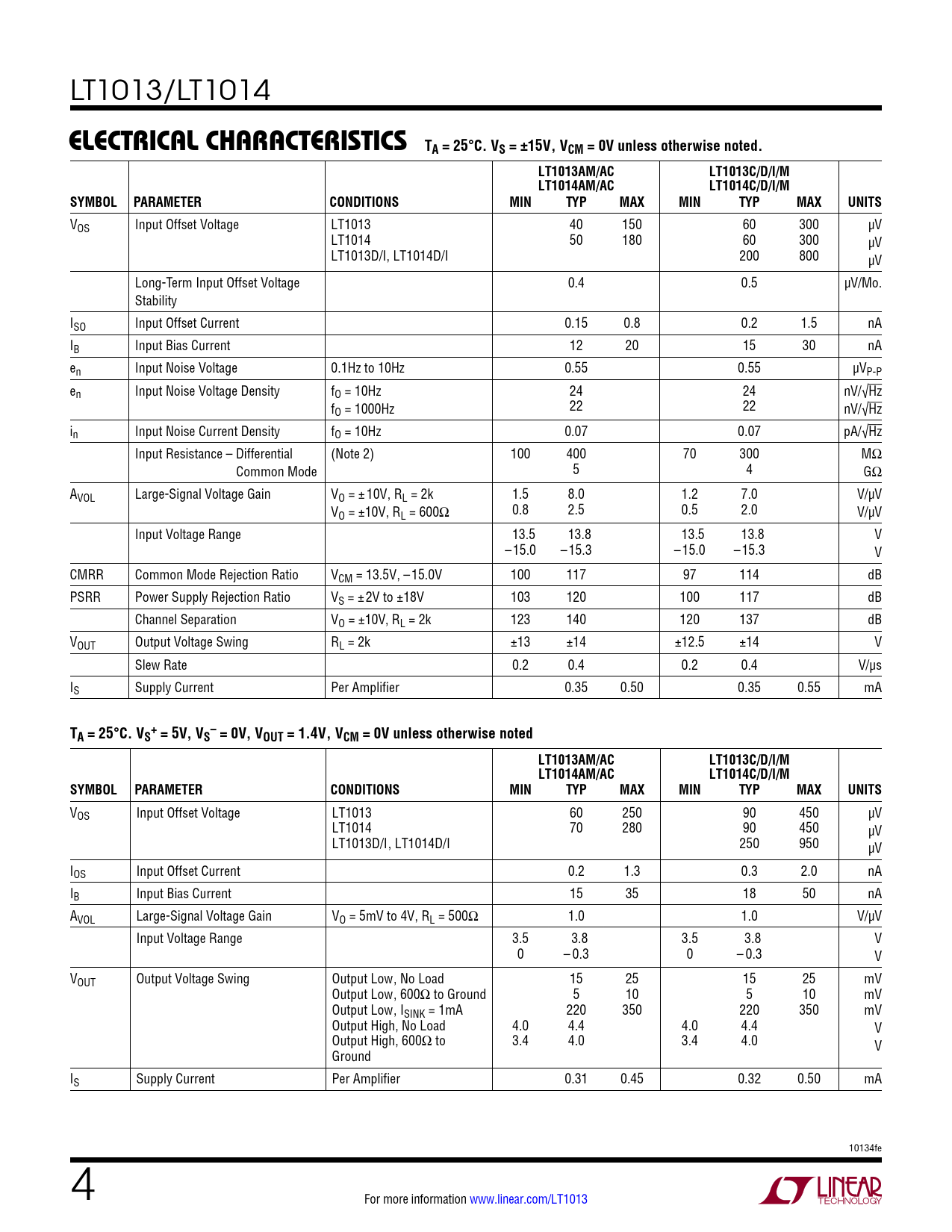 elecTrical characTerisTics. TA = 25°C. VS = ±15V, VCM = 0V unless otherwise noted. LT1013AM/AC. LT1013C/D/I/M. LT1014AM/AC