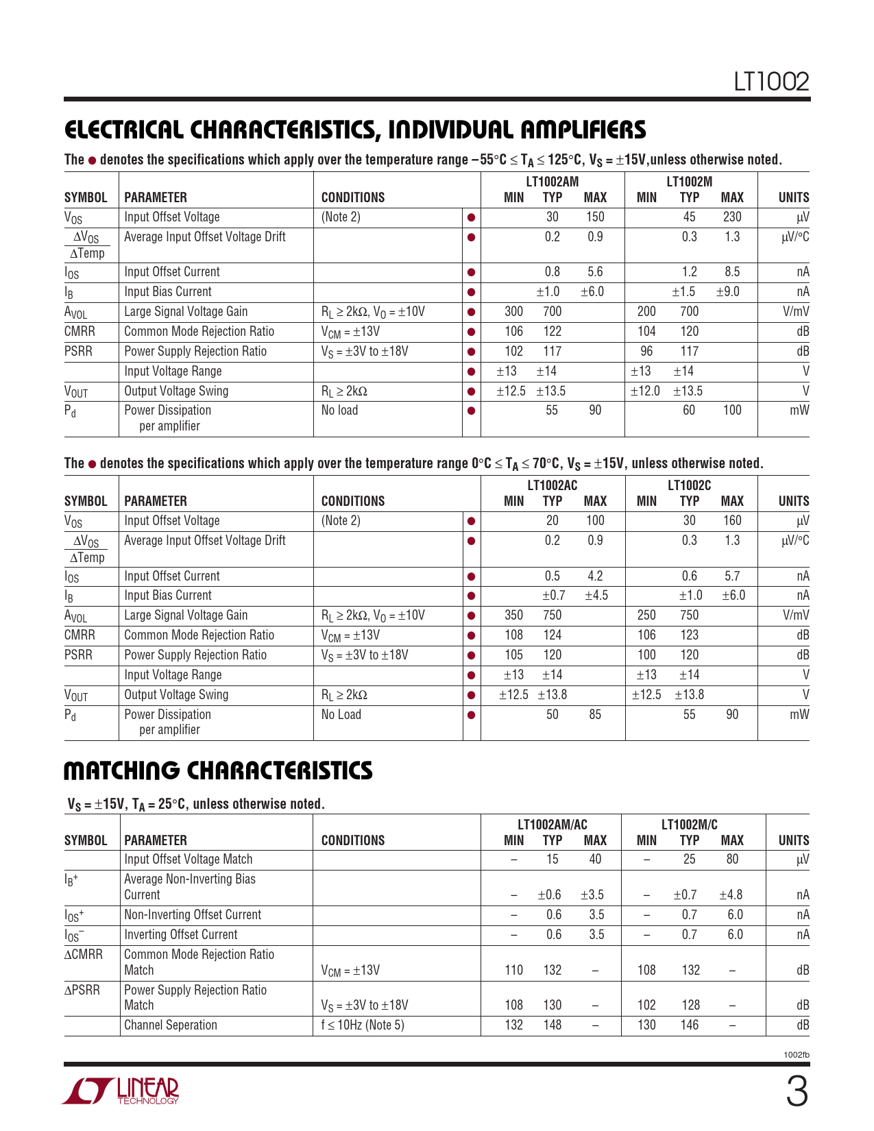 C, unless otherwise noted. LT1002AM/AC LT1002M/C SYMBOL PARAMETER CONDITIONS MIN TYP MAX MIN TYP MAX UNITS