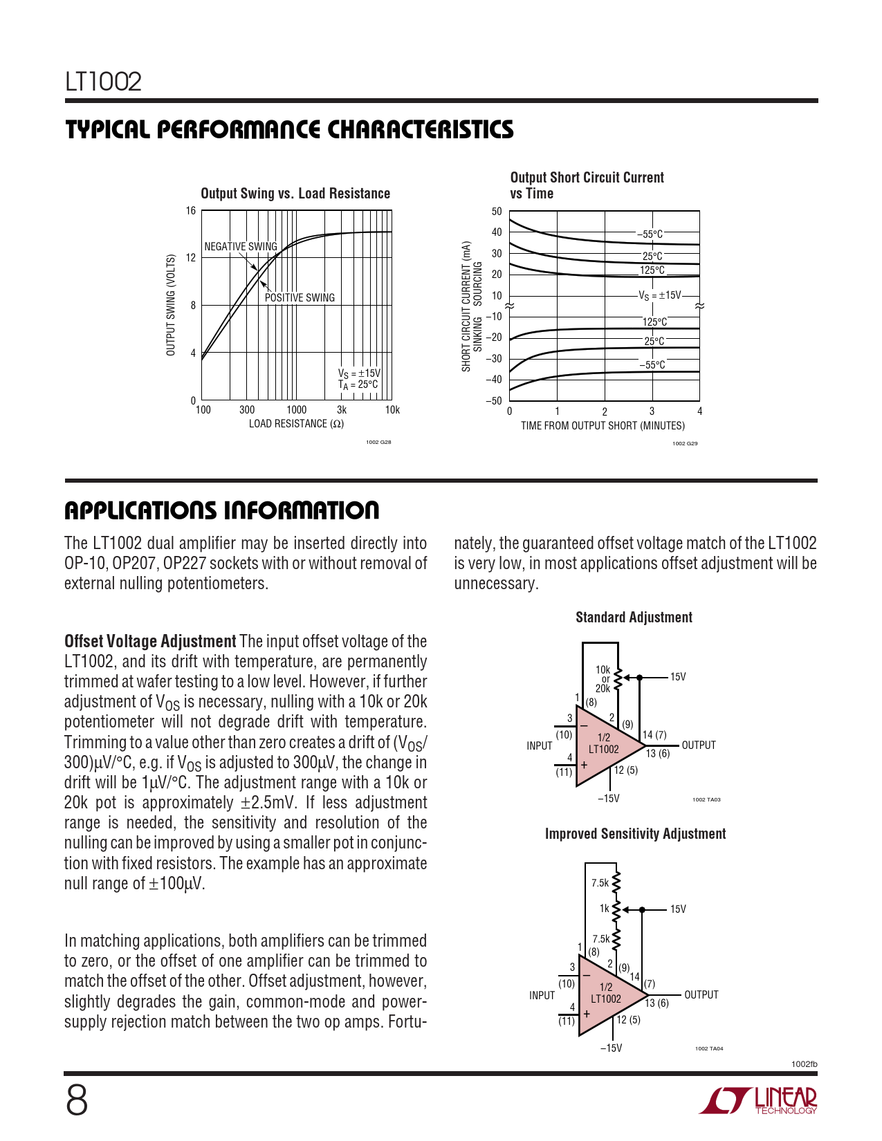 The input offset voltage of the LT1002, and its drift with temperature, are permanently 10k trimmed at wafer testing to a low level. However, if further or 15V 20k adjustment of V 1 OS is necessary, nulling with a 10k or 20k (8) potentiometer will not degrade drift with temperature. 3 – 2 (9) Trimming to a value other than zero creates a drift of (V (10) 1/2 14 (7) OS/ INPUT LT1002 OUTPUT 13 (6) 300)µV/°C, e.g. if V 4 + OS is adjusted to 300µV, the change in (11) 12 (5) drift will be 1µV/°C. The adjustment range with a 10k or 20k pot is approximately ±2.5mV. If less adjustment –15V 1002 TA03 range is needed, the sensitivity and resolution of the