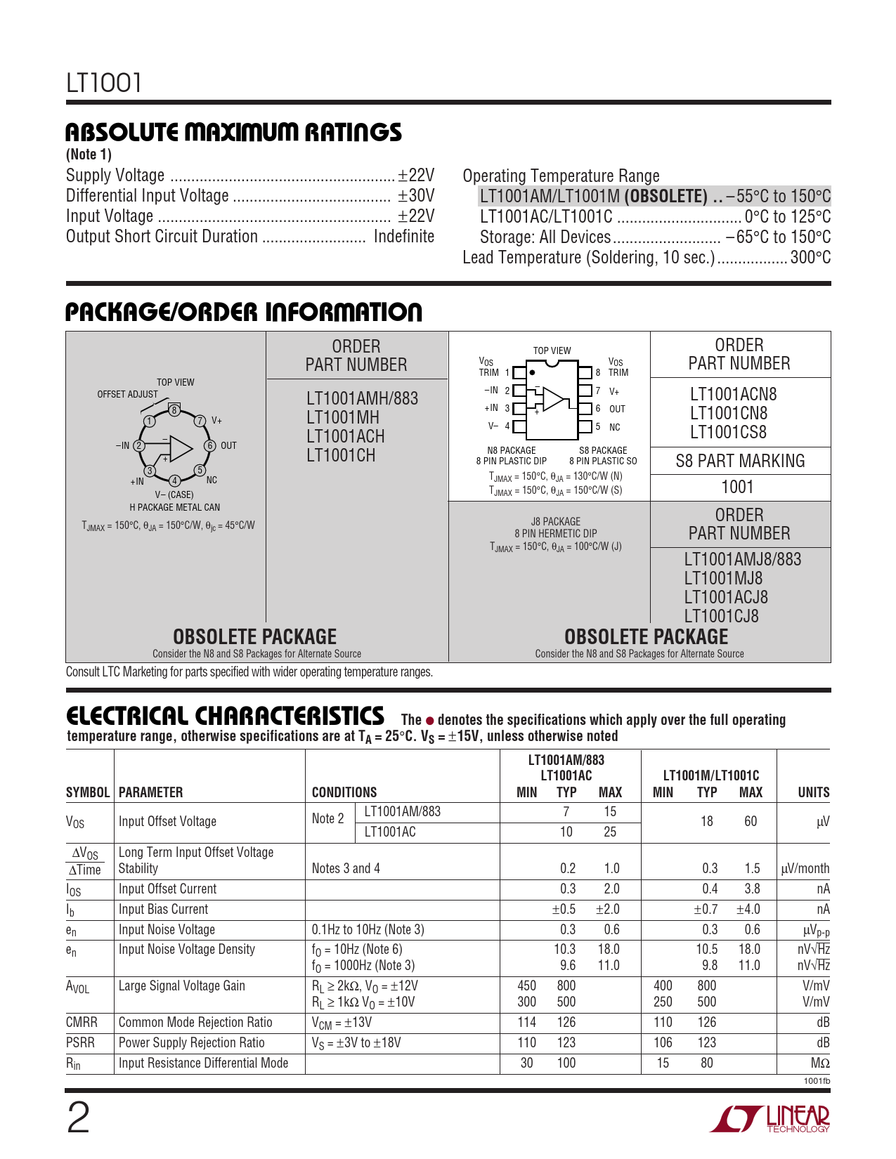LT1001 WWWUABSOLUTE MAXIMUM RATINGS(Note 1) Supply Voltage .. ±22V Operating Temperature Range Differential Input Voltage .. ±30V LT1001AM/LT1001M (OBSOLETE) .. – 55°C to 150°C Input Voltage .. ±22V LT1001AC/LT1001C .. 0°C to 125°C Output Short Circuit Duration ... Indefinite Storage: All Devices.. – 65°C to 150°C Lead Temperature (Soldering, 10 sec.)... 300°C UWUPACKAGE/ORDER INFORMATION ORDER ORDER TOP VIEW PART NUMBER VOS VOS PART NUMBER TRIM 1 8 TRIM TOP VIEW – OFFSET ADJUST –IN LT1001AMH/883 2 7 V+ LT1001ACN8 8 +IN 3 6 OUT + 1 7 V+ LT1001MH LT1001CN8 V– 4 5 NC – LT1001ACH LT1001CS8 –IN 2 6 OUT N8 PACKAGE S8 PACKAGE + LT1001CH 8 PIN PLASTIC DIP 8 PIN PLASTIC SO S8 PART MARKING 3 5 T +IN 4 NC JMAX = 150°C, θJA = 130°C/W (N) TJMAX = 150°C, θJA = 150°C/W (S) 1001 V– (CASE) H PACKAGE METAL CAN ORDER J8 PACKAGE TJMAX = 150°C, θJA = 150°C/W, θjc = 45°C/W 8 PIN HERMETIC DIP PART NUMBER TJMAX = 150°C, θJA = 100°C/W (J) LT1001AMJ8/883 LT1001MJ8 LT1001ACJ8 LT1001CJ8 OBSOLETE PACKAGEOBSOLETE PACKAGE Consider the N8 and S8 Packages for Alternate Source Consider the N8 and S8 Packages for Alternate Source Consult LTC Marketing for parts specified with wider operating temperature ranges. ELECTRICAL CHARACTERISTICS The ● denotes the specifications which apply over the full operatingtemperature range, otherwise specifications are at TA = 25 ° C. VS = ± 15V, unless otherwise notedLT1001AM/883LT1001ACLT1001M/LT1001CSYMBOL PARAMETERCONDITIONSMINTYPMAXMINTYPMAXUNITS LT1001AM/883 7 15 VOS Input Offset Voltage Note 2 18 60 µV LT1001AC 10 25 ∆VOS Long Term Input Offset Voltage ∆Time Stability Notes 3 and 4 0.2 1.0 0.3 1.5 µV/month IOS Input Offset Current 0.3 2.0 0.4 3.8 nA Ib Input Bias Current ±0.5 ±2.0 ±0.7 ±4.0 nA en Input Noise Voltage 0.1Hz to 10Hz (Note 3) 0.3 0.6 0.3 0.6 µVp-p en Input Noise Voltage Density fO = 10Hz (Note 6) 10.3 18.0 10.5 18.0 nV√Hz fO = 1000Hz (Note 3) 9.6 11.0 9.8 11.0 nV√Hz AVOL Large Signal Voltage Gain RL ≥ 2kΩ, VO = ±12V 450 800 400 800 V/mV RL ≥ 1kΩ VO = ±10V 300 500 250 500 V/mV CMRR Common Mode Rejection Ratio VCM = ±13V 114 126 110 126 dB PSRR Power Supply Rejection Ratio VS = ±3V to ±18V 110 123 106 123 dB Rin Input Resistance Differential Mode 30 100 15 80 MΩ 1001fb 2
