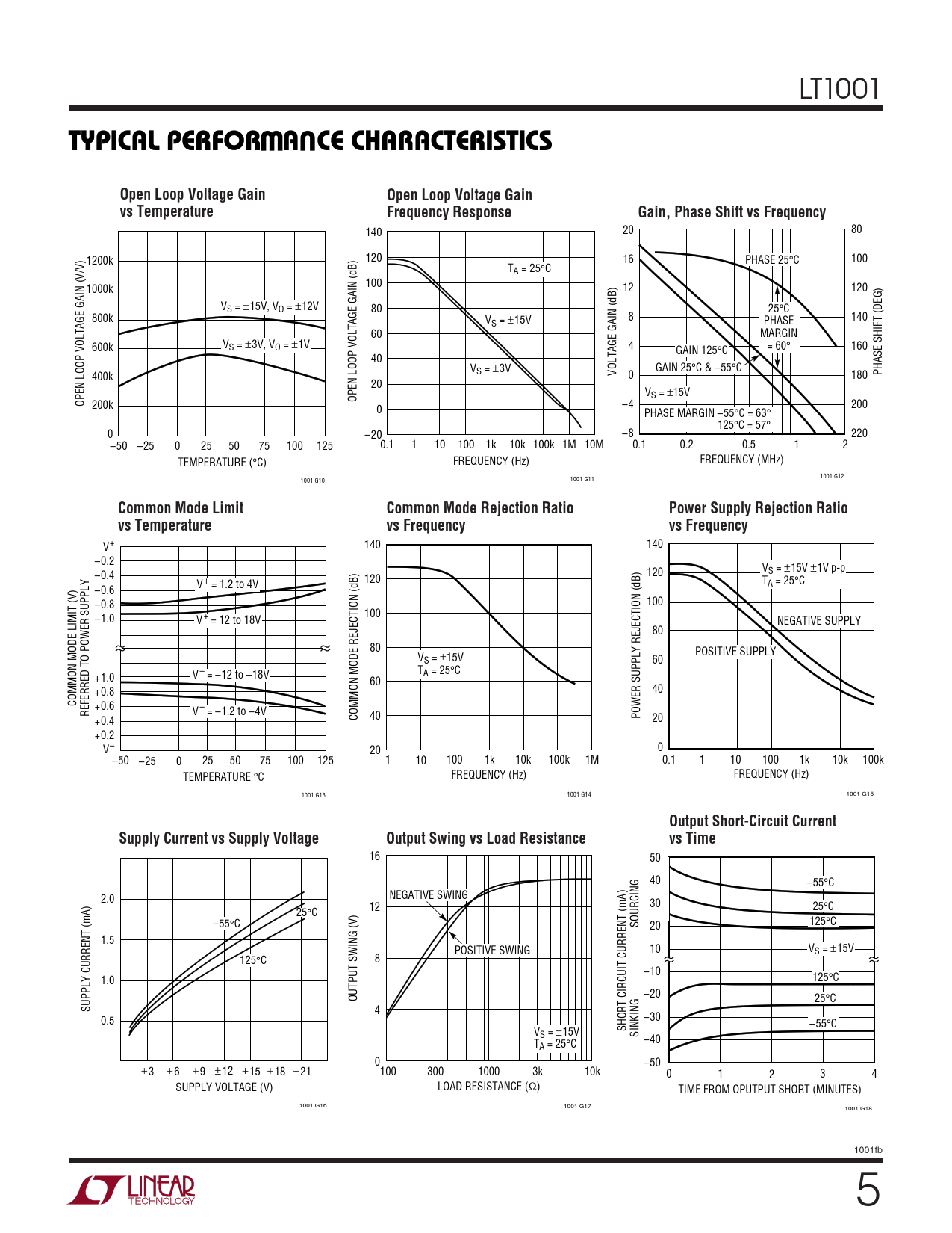 16 50 40 –55°C 2.0 NEGATIVE SWING 12 30 25°C 25°C –55°C SOURCING 20 125°C 1.5 POSITIVE SWING 10 VS = ±15V 125°C 8 –10 1.0 125°C OUTPUT SWING (V) –20 25°C SUPPLY CURRENT (mA) 4 0.5 –30 –55°C V SHORT CIRCUIT CURRENT (mA) S = ±15V SINKING T –40 A = 25°C 0 –50 ±3 ±6 ±9 ±12 ±15 ±18 ±21 100 300 1000 3k 10k 0 1 2 3 4 SUPPLY VOLTAGE (V) LOAD RESISTANCE (Ω) TIME FROM OPUTPUT SHORT (MINUTES) 1001 G16 1001 G17 1001 G18 1001fb 5