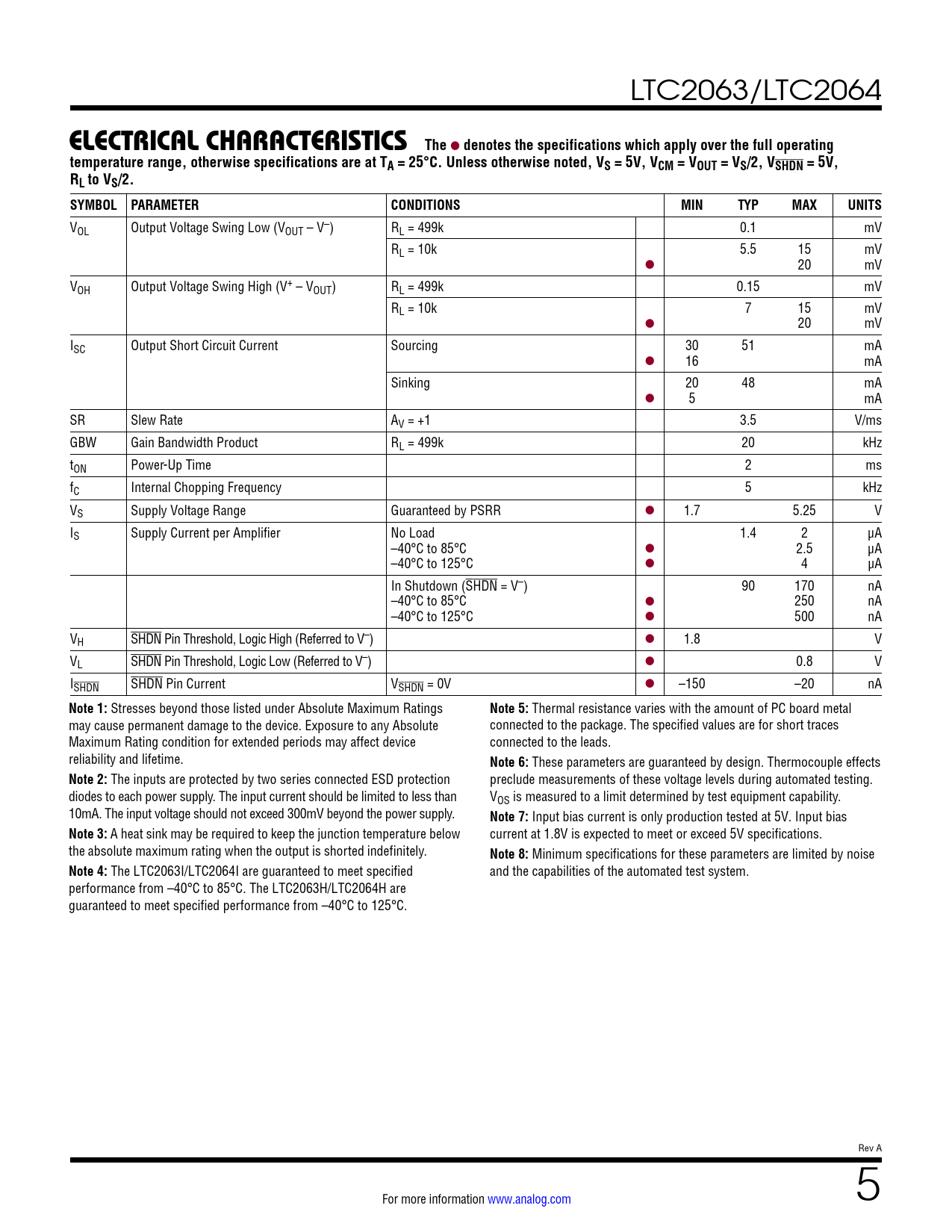 VOL Output Voltage Swing Low (VOUT – V–) RL = 499k 0.1 mV RL = 10k 5.5 15 mV l 20 mV VOH Output Voltage Swing High (V+ – VOUT) RL = 499k 0.15 mV RL = 10k 7 15 mV l 20 mV ISC Output Short Circuit Current Sourcing 30 51 mA l 16 mA Sinking 20 48 mA l 5 mA SR Slew Rate AV = +1 3.5 V/ms GBW Gain Bandwidth Product RL = 499k 20 kHz tON Power-Up Time 2 ms fC Internal Chopping Frequency 5 kHz VS Supply Voltage Range Guaranteed by PSRR l 1.7 5.25 V IS Supply Current per Amplifier No Load 1.4 2 μA –40°C to 85°C l 2.5 μA –40°C to 125°C l 4 µA In Shutdown (SHDN = V–) 90 170 nA –40°C to 85°C l 250 nA –40°C to 125°C l 500 nA VH SHDN Pin Threshold, Logic High (Referred to V–) l 1.8 V VL SHDN Pin Threshold, Logic Low (Referred to V–) l 0.8 V ISHDN SHDN Pin Current VSHDN = 0V l –150 –20 nA