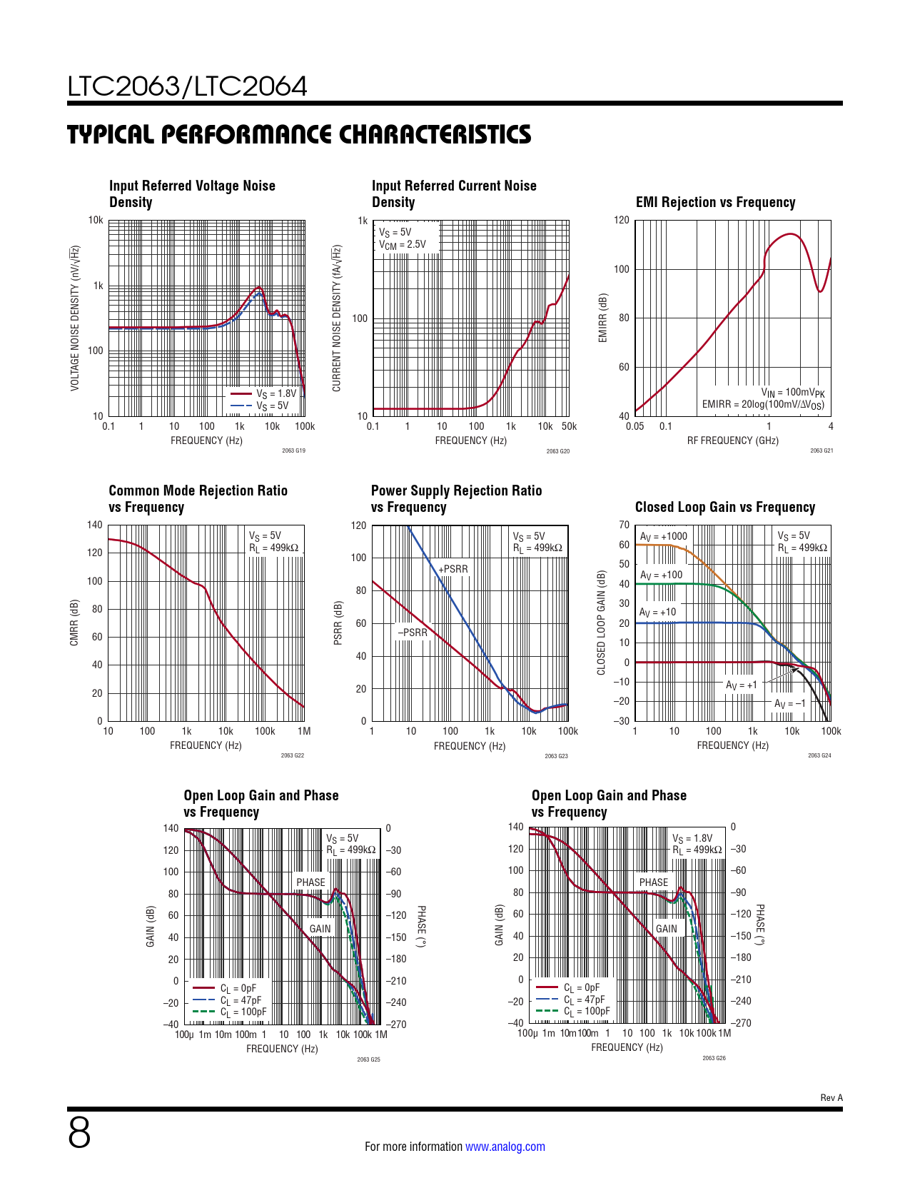 140 120 70 VS = 5V VS = 5V AV = +1000 VS = 5V 60 RL = 499kΩ R R L = 499kΩ L = 499kΩ 120 100 50 +PSRR AV = +100 100 40 80 30 80 AV = +10 60 20 60 –PSRR CMRR (dB) PSRR (dB) 10 40 0 40 CLOSED LOOP GAIN (dB) –10 A 20 V = +1 20 –20 AV = –1 0 0 –30 10 100 1k 10k 100k 1M 1 10 100 1k 10k 100k 1 10 100 1k 10k 100k FREQUENCY (Hz) FREQUENCY (Hz) FREQUENCY (Hz) 2063 G22 2063 G23 2063 G24