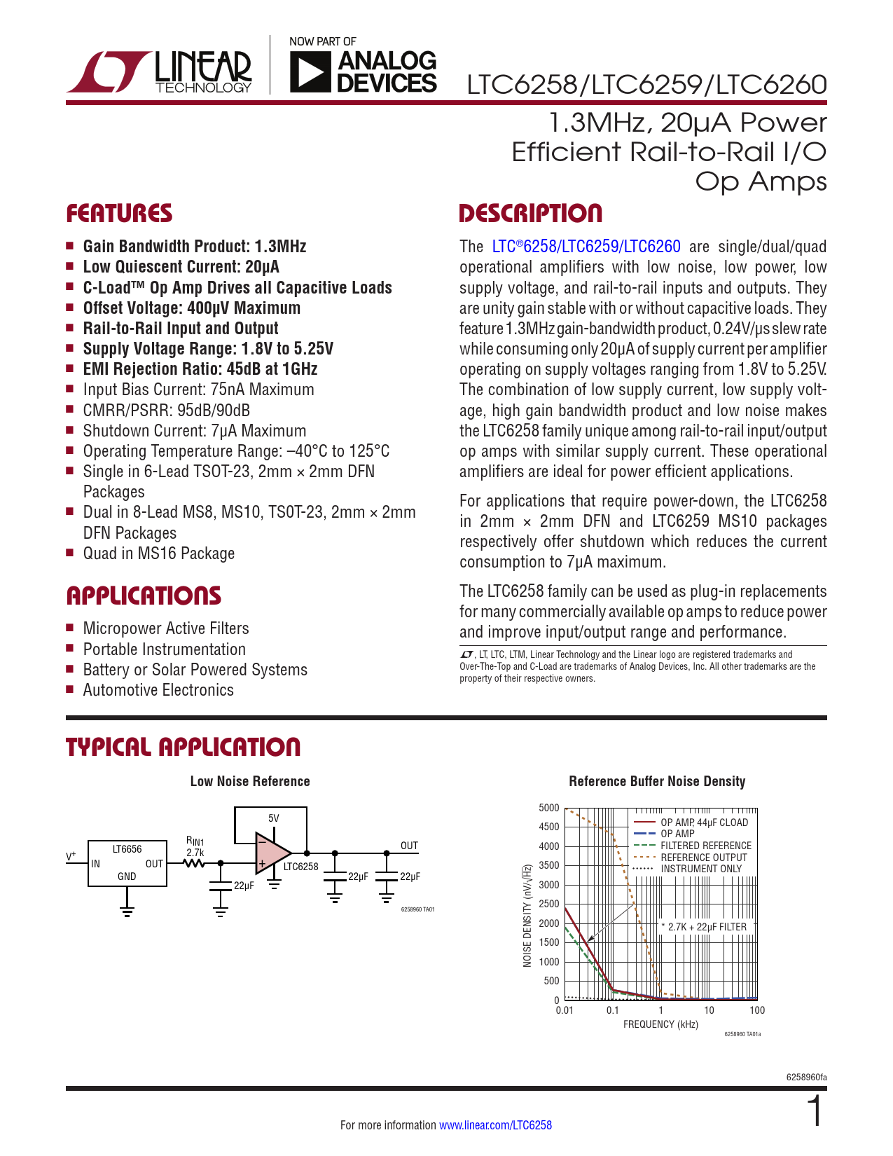 The LTC6258 family can be used as plug-in replacements for many commercially available op amps to reduce power n Micropower Active Filters and improve input/output range and performance. n Portable Instrumentation L, LT, LTC, LTM, Linear Technology and the Linear logo are registered trademarks and n Battery or Solar Powered Systems Over-The-Top and C-Load are trademarks of Analog Devices, Inc. All other trademarks are the property of their respective owners. n Automotive Electronics
