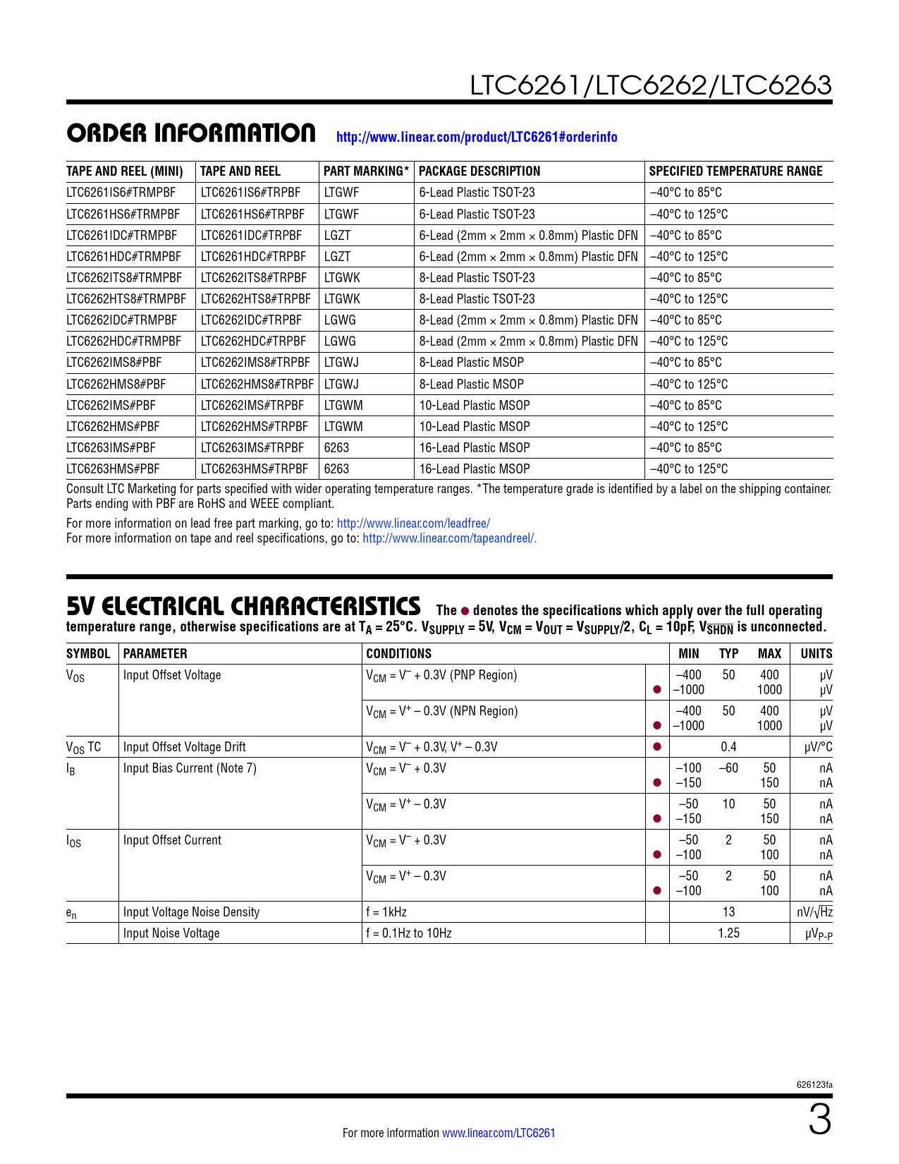 LTC6261/LTC6262/LTC6263 orDer inForMAtion http://www.linear.com/product/LTC6261#orderinfoTAPE AND REEL (MINI)TAPE AND REELPART MARKING* PACKAGE DESCRIPTIONSPECIFIED TEMPERATURE RANGE LTC6261IS6#TRMPBF LTC6261IS6#TRPBF LTGWF 6-Lead Plastic TSOT-23 –40°C to 85°C LTC6261HS6#TRMPBF LTC6261HS6#TRPBF LTGWF 6-Lead Plastic TSOT-23 –40°C to 125°C LTC6261IDC#TRMPBF LTC6261IDC#TRPBF LGZT 6-Lead (2mm × 2mm × 0.8mm) Plastic DFN –40°C to 85°C LTC6261HDC#TRMPBF LTC6261HDC#TRPBF LGZT 6-Lead (2mm × 2mm × 0.8mm) Plastic DFN –40°C to 125°C LTC6262ITS8#TRMPBF LTC6262ITS8#TRPBF LTGWK 8-Lead Plastic TSOT-23 –40°C to 85°C LTC6262HTS8#TRMPBF LTC6262HTS8#TRPBF LTGWK 8-Lead Plastic TSOT-23 –40°C to 125°C LTC6262IDC#TRMPBF LTC6262IDC#TRPBF LGWG 8-Lead (2mm × 2mm × 0.8mm) Plastic DFN –40°C to 85°C LTC6262HDC#TRMPBF LTC6262HDC#TRPBF LGWG 8-Lead (2mm × 2mm × 0.8mm) Plastic DFN –40°C to 125°C LTC6262IMS8#PBF LTC6262IMS8#TRPBF LTGWJ 8-Lead Plastic MSOP –40°C to 85°C LTC6262HMS8#PBF LTC6262HMS8#TRPBF LTGWJ 8-Lead Plastic MSOP –40°C to 125°C LTC6262IMS#PBF LTC6262IMS#TRPBF LTGWM 10-Lead Plastic MSOP –40°C to 85°C LTC6262HMS#PBF LTC6262HMS#TRPBF LTGWM 10-Lead Plastic MSOP –40°C to 125°C LTC6263IMS#PBF LTC6263IMS#TRPBF 6263 16-Lead Plastic MSOP –40°C to 85°C LTC6263HMS#PBF LTC6263HMS#TRPBF 6263 16-Lead Plastic MSOP –40°C to 125°C Consult LTC Marketing for parts specified with wider operating temperature ranges. *The temperature grade is identified by a label on the shipping container. Parts ending with PBF are RoHS and WEEE compliant. For more information on lead free part marking, go to: http://www.linear.com/leadfree/ For more information on tape and reel specifications, go to: http://www.linear.com/tapeandreel/. 5V electricAl chArActeristicsThe l denotes the specifications which apply over the full operatingtemperature range, otherwise specifications are at TA = 25°C. VSUPPLY = 5V, VCM = VOUT = VSUPPLY/2, CL = 10pF, VSHDN is unconnected. SYMBOL PARAMETERCONDITIONSMINTYPMAXUNITS VOS Input Offset Voltage VCM = V– + 0.3V (PNP Region) –400 50 400 µV l –1000 1000 µV VCM = V+ – 0.3V (NPN Region) –400 50 400 µV l –1000 1000 µV VOS TC Input Offset Voltage Drift VCM = V– + 0.3V, V+ – 0.3V l 0.4 µV/°C IB Input Bias Current (Note 7) VCM = V– + 0.3V –100 –60 50 nA l –150 150 nA VCM = V+ – 0.3V –50 10 50 nA l –150 150 nA IOS Input Offset Current VCM = V– + 0.3V –50 2 50 nA l –100 100 nA VCM = V+ – 0.3V –50 2 50 nA l –100 100 nA en Input Voltage Noise Density f = 1kHz 13 nV/√Hz Input Noise Voltage f = 0.1Hz to 10Hz 1.25 µVP-P 626123fa For more information www.linear.com/LTC6261 3 Document Outline Features Applications Description Typical Application Absolute Maximum Ratings Pin Configuration Order Information 5V Electrical Characteristics 1.8V Electrical Characteristics Typical Performance Characteristics Pin Functions Simplified Schematic Operation Applications Information Package Description Typical Application Related Parts