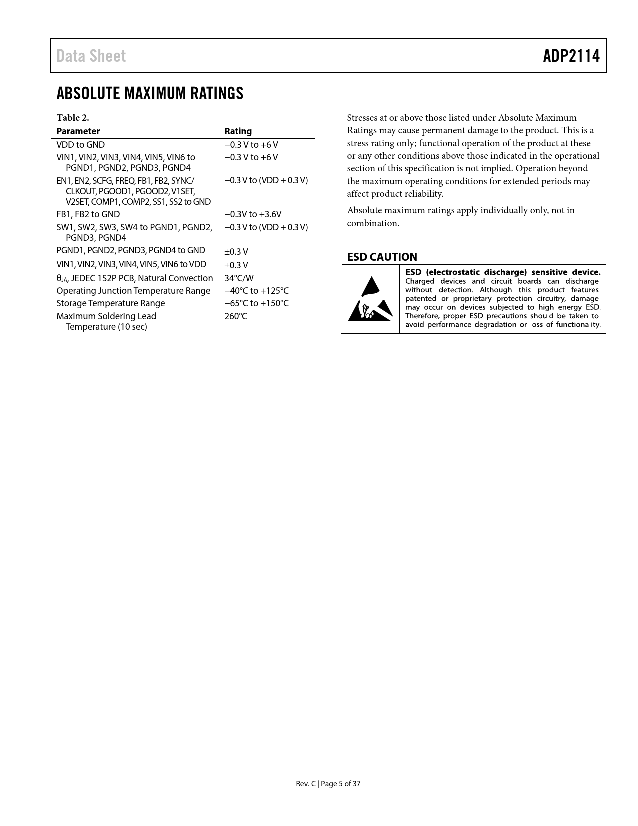 Pages / Page37 / 5 — Data Sheet. ADP2114. ABSOLUTE MAXIMUM RATINGS. Table 2. Parameter Rating. …