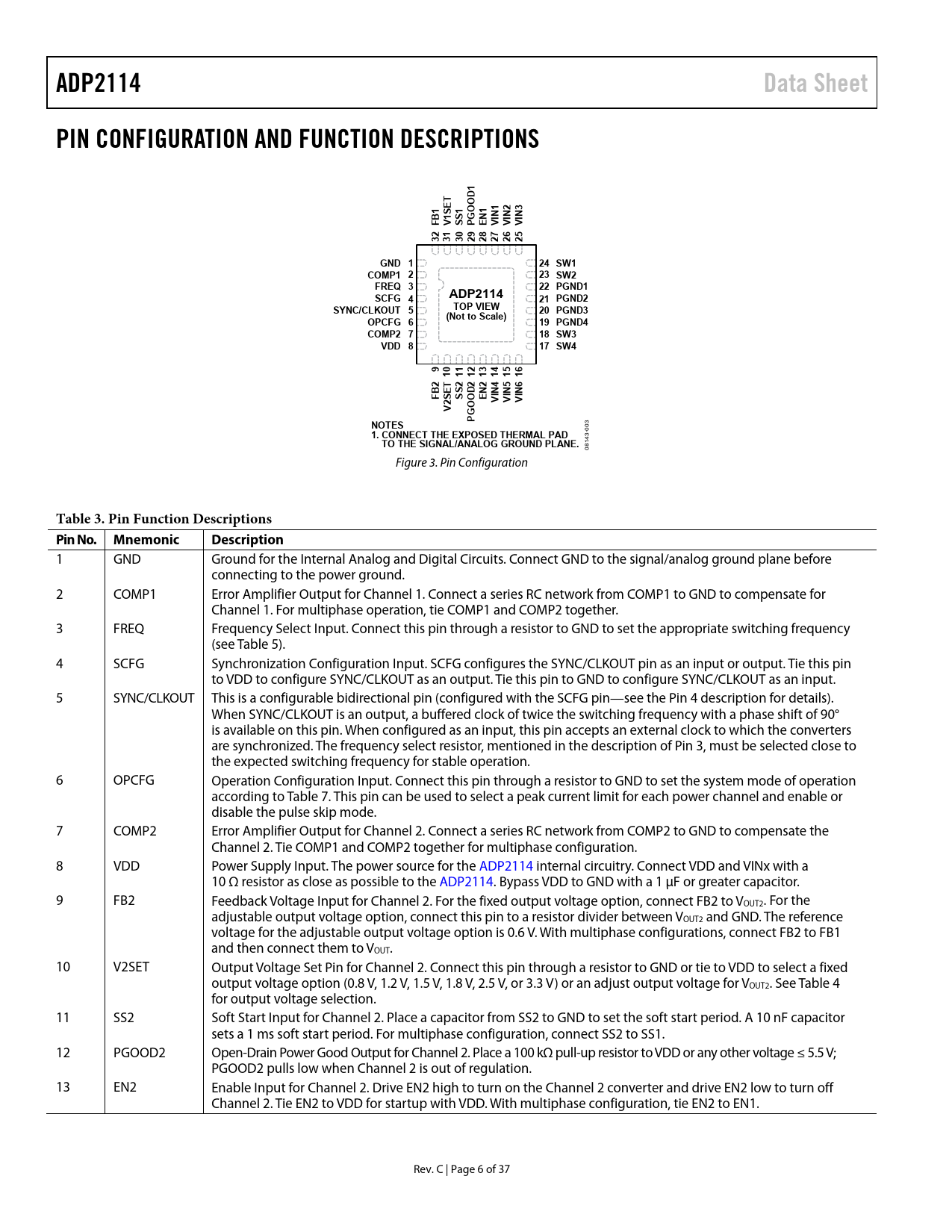 link to page 25 link to page 26 link to page 24 ADP2114Data SheetPIN CONFIGURATION AND FUNCTION DESCRIPTIONS1 D1SET11123GOONNNFBV1SSPENVIVIVI3231302928272625GND 124 SW1COMP1 223 SW2FREQ 322 PGND1ADP2114SCFG 421 PGND2SYNC/CLKOUT 5TOP VIEW20 PGND3(Not to Scale)OPCFG 619 PGND4COMP2 718 SW3VDD 817 SW49101112131415162T222456EDNNNFBSSOENVIVIVIV2SO PGNOTES 3 00 1. CONNECT THE EXPOSED THERMAL PAD 3- TO THE SIGNAL/ANALOG GROUND PLANE. 1408 Figure 3. Pin Configuration Table 3. Pin Function Descriptions Pin No.MnemonicDescription 1 GND Ground for the Internal Analog and Digital Circuits. Connect GND to the signal/analog ground plane before connecting to the power ground. 2 COMP1 Error Amplifier Output for Channel 1. Connect a series RC network from COMP1 to GND to compensate for Channel 1. For multiphase operation, tie COMP1 and COMP2 together. 3 FREQ Frequency Select Input. Connect this pin through a resistor to GND to set the appropriate switching frequency (see Table 5). 4 SCFG Synchronization Configuration Input. SCFG configures the SYNC/CLKOUT pin as an input or output. Tie this pin to VDD to configure SYNC/CLKOUT as an output. Tie this pin to GND to configure SYNC/CLKOUT as an input. 5 SYNC/CLKOUT This is a configurable bidirectional pin (configured with the SCFG pin—see the Pin 4 description for details). When SYNC/CLKOUT is an output, a buffered clock of twice the switching frequency with a phase shift of 90° is available on this pin. When configured as an input, this pin accepts an external clock to which the converters are synchronized. The frequency select resistor, mentioned in the description of Pin 3, must be selected close to the expected switching frequency for stable operation. 6 OPCFG Operation Configuration Input. Connect this pin through a resistor to GND to set the system mode of operation according to Table 7. This pin can be used to select a peak current limit for each power channel and enable or disable the pulse skip mode. 7 COMP2 Error Amplifier Output for Channel 2. Connect a series RC network from COMP2 to GND to compensate the Channel 2. Tie COMP1 and COMP2 together for multiphase configuration. 8 VDD Power Supply Input. The power source for the ADP2114 internal circuitry. Connect VDD and VINx with a 10 Ω resistor as close as possible to the ADP2114. Bypass VDD to GND with a 1 μF or greater capacitor. 9 FB2 Feedback Voltage Input for Channel 2. For the fixed output voltage option, connect FB2 to VOUT2. For the adjustable output voltage option, connect this pin to a resistor divider between VOUT2 and GND. The reference voltage for the adjustable output voltage option is 0.6 V. With multiphase configurations, connect FB2 to FB1 and then connect them to VOUT. 10 V2SET Output Voltage Set Pin for Channel 2. Connect this pin through a resistor to GND or tie to VDD to select a fixed output voltage option (0.8 V, 1.2 V, 1.5 V, 1.8 V, 2.5 V, or 3.3 V) or an adjust output voltage for VOUT2. See Table 4 for output voltage selection. 11 SS2 Soft Start Input for Channel 2. Place a capacitor from SS2 to GND to set the soft start period. A 10 nF capacitor sets a 1 ms soft start period. For multiphase configuration, connect SS2 to SS1. 12 PGOOD2 Open-Drain Power Good Output for Channel 2. Place a 100 kΩ pull-up resistor to VDD or any other voltage ≤ 5.5 V; PGOOD2 pulls low when Channel 2 is out of regulation. 13 EN2 Enable Input for Channel 2. Drive EN2 high to turn on the Channel 2 converter and drive EN2 low to turn off Channel 2. Tie EN2 to VDD for startup with VDD. With multiphase configuration, tie EN2 to EN1. Rev. C | Page 6 of 37 Document Outline FEATURES APPLICATIONS GENERAL DESCRIPTION TYPICAL APPLICATION CIRCUIT TABLE OF CONTENTS REVISION HISTORY SPECIFICATIONS ABSOLUTE MAXIMUM RATINGS ESD CAUTION PIN CONFIGURATION AND FUNCTION DESCRIPTIONS TYPICAL PERFORMANCE CHARACTERISTICS SUPPLY CURRENT LOAD TRANSIENT RESPONSE BODE PLOTS SIMPLIFIED BLOCK DIAGRAM THEORY OF OPERATION ADIsimPower DESIGN TOOL CONTROL ARCHITECTURE UNDERVOLTAGE LOCKOUT (UVLO) ENABLE/DISABLE CONTROL SOFT START POWER GOOD PULSE SKIP MODE HICCUP MODE CURRENT LIMIT THERMAL OVERLOAD PROTECTION MAXIMUM DUTY CYCLE OPERATION SYNCHRONIZATION CONVERTER CONFIGURATION SELECTING THE OUTPUT VOLTAGE SETTING THE OSCILLATOR FREQUENCY SYNCHRONIZATION AND CLKOUT OPERATION MODE CONFIGURATION EXTERNAL COMPONENTS SELECTION INPUT CAPACITOR SELECTION VDD RC FILTER INDUCTOR SELECTION OUTPUT CAPACITOR SELECTION CONTROL LOOP COMPENSATION DESIGN EXAMPLE CHANNEL 1 CONFIGURATION AND COMPONENTS SELECTION CHANNEL 2 CONFIGURATION AND COMPONENTS SELECTION SYSTEM CONFIGURATION APPLICATION CIRCUITS POWER DISSIPATION, THERMAL CONSIDERATIONS CIRCUIT BOARD LAYOUT RECOMMENDATIONS OUTLINE DIMENSIONS ORDERING GUIDE