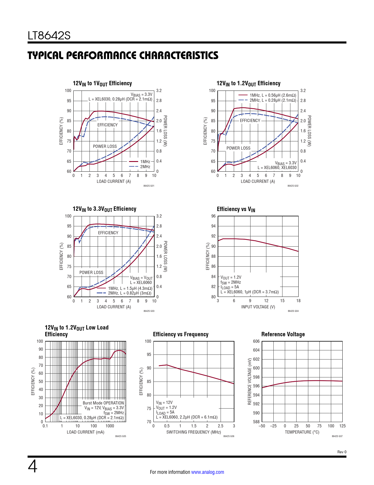 100 100 606 90 604 95 80 602 70 90 600 60 TAGE (mV) 598 50 85 596 40 EFFICIENCY (%) EFFICIENCY (%) 80 594 30 Burst Mode OPERATION VIN = 12V 20 REFERENCE VOL 592 V V IN = 12V, VBIAS = 3.3V 75 OUT = 1.2V f I 10 SW = 2MHz LOAD = 5A 590 L = XEL6030, 0.28µH (DCR = 2.1mΩ) L = XEL6060, 2.2µH (DCR = 6.1mΩ) 0 70 588 0.1 1 10 100 1000 0 0.5 1 1.5 2 2.5 3 –50 –25 0 25 50 75 100 125 LOAD CURRENT (mA) SWITCHING FREQUENCY (MHz) TEMPERATURE (°C) 8642S G05 8642S G06 8642S G07 Rev 0 4 For more information www.analog.com Document Outline Features Applications Typical Application Description Absolute Maximum Ratings Order Information Electrical Characteristics Pin Configuration Typical Performance Characteristics Pin Functions Block Diagram Operation Applications Information Package Description Typical Applications Related Parts