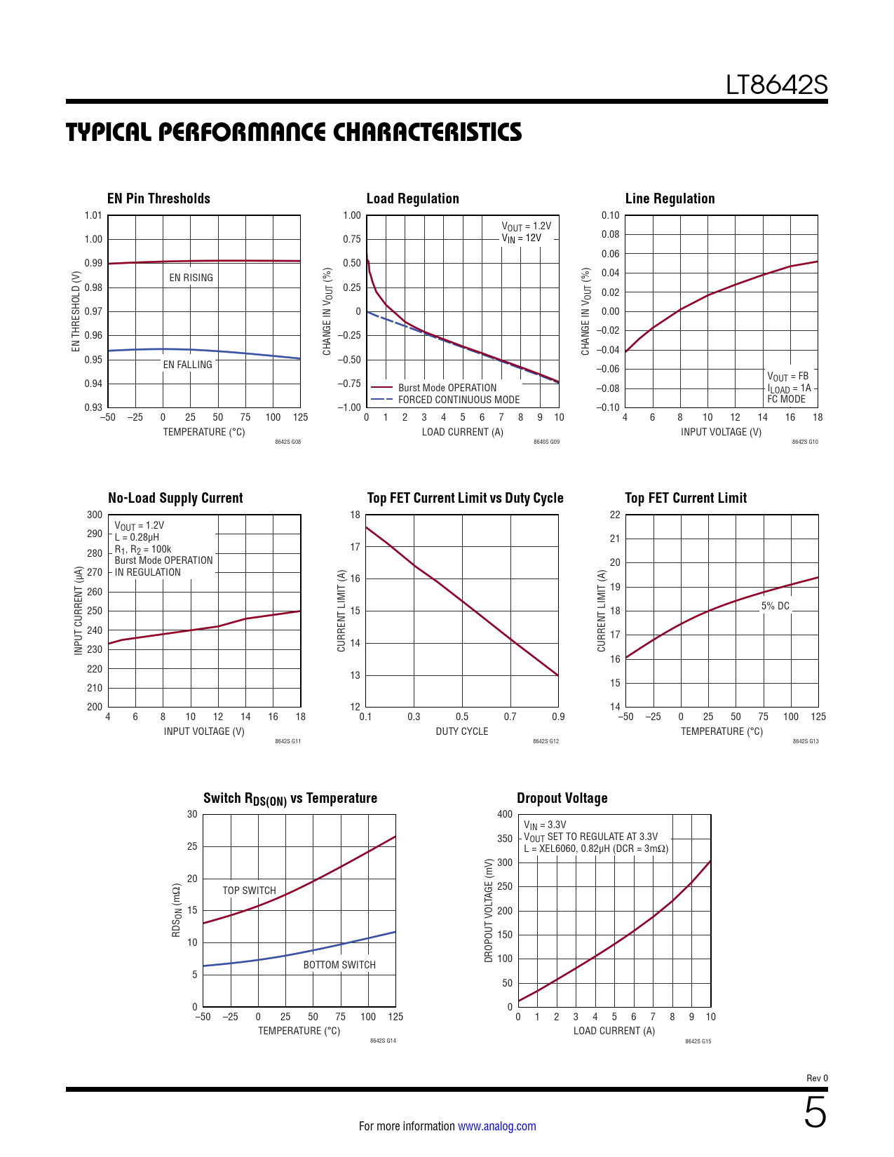300 18 22 VOUT = 1.2V 290 L = 0.28µH 21 R 17 280 1, R2 = 100k Burst Mode OPERATION 20 270 IN REGULATION 16 260 19 250 15 5% DC 18 240 17 14 230 INPUT CURRENT (µA) CURRENT LIMIT (A) CURRENT LIMIT (A) 16 220 13 210 15 200 12 14 4 6 8 10 12 14 16 18 0.1 0.3 0.5 0.7 0.9 –50 –25 0 25 50 75 100 125 INPUT VOLTAGE (V) DUTY CYCLE TEMPERATURE (°C) 8642S G11 8642S G12 8642S G13
