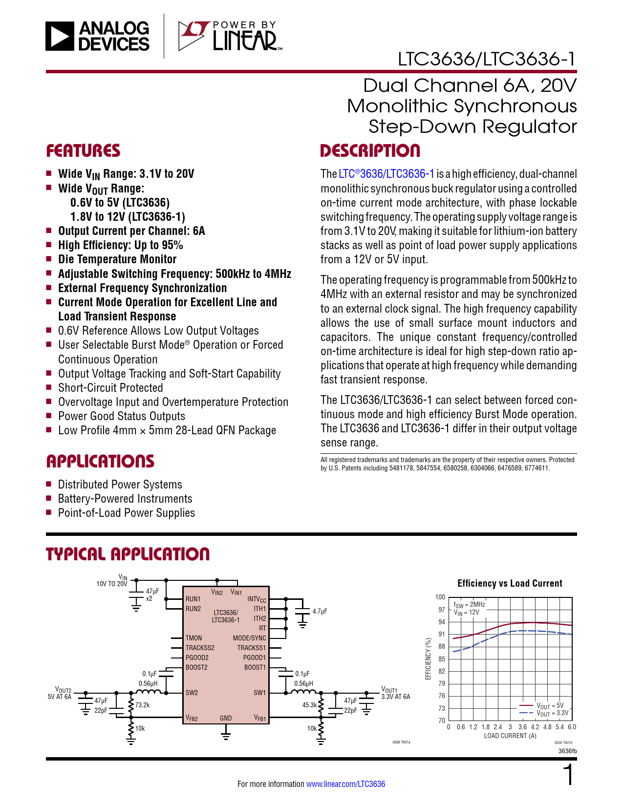 LTC3636/LTC3636-1 Dual Channel 6A, 20V Monolithic Synchronous Step-Down Regulator FEATURESDESCRIPTION n Wide VIN Range: 3.1V to 20V The LTC®3636/LTC3636-1 is a high efficiency, dual-channel n Wide VOUT Range: monolithic synchronous buck regulator using a controlled 0.6V to 5V (LTC3636) on-time current mode architecture, with phase lockable 1.8V to 12V (LTC3636-1) switching frequency. The operating supply voltage range is n Output Current per Channel: 6A from 3.1V to 20V, making it suitable for lithium-ion battery n High Efficiency: Up to 95% stacks as well as point of load power supply applications n Die Temperature Monitor from a 12V or 5V input. n Adjustable Switching Frequency: 500kHz to 4MHz The operating frequency is programmable from 500kHz to n External Frequency Synchronization 4MHz with an external resistor and may be synchronized n Current Mode Operation for Excellent Line and to an external clock signal. The high frequency capability Load Transient Response allows the use of small surface mount inductors and n 0.6V Reference Allows Low Output Voltages capacitors. The unique constant frequency/controlled n User Selectable Burst Mode® Operation or Forced on-time architecture is ideal for high step-down ratio ap- Continuous Operation plications that operate at high frequency while demanding n Output Voltage Tracking and Soft-Start Capability fast transient response. n Short-Circuit Protected n Overvoltage Input and Overtemperature Protection The LTC3636/LTC3636-1 can select between forced con- n Power Good Status Outputs tinuous mode and high efficiency Burst Mode operation. n Low Profile 4mm × 5mm 28-Lead QFN Package The LTC3636 and LTC3636-1 differ in their output voltage sense range. APPLICATIONS All registered trademarks and trademarks are the property of their respective owners. Protected by U.S. Patents including 5481178, 5847554, 6580258, 6304066, 6476589, 6774611. n Distributed Power Systems n Battery-Powered Instruments n Point-of-Load Power Supplies TYPICAL APPLICATION VIN 10V TO 20V Efficiency vs Load Current 47µF VIN2 VIN1 x2 100 RUN1 INTVCC fSW = 2MHz RUN2 ITH1 4.7µF 97 LTC3636/ VIN = 12V LTC3636-1 ITH2 94 RT 91 TMON MODE/SYNC TRACKSS2 TRACKSS1 88 PGOOD2 PGOOD1 85 BOOST2 BOOST1 82 0.1µF 0.1µF EFFICIENCY (%) 0.56µH 0.56µH 79 VOUT2 SW2 SW1 VOUT1 5V AT 6A 3.3V AT 6A 76 47µF 47µF 73.2k 45.3k V 73 OUT = 5V 22pF 22pF VOUT = 3.3V VFB2 GND VFB1 70 10k 10k 0 0.6 1.2 1.8 2.4 3 3.6 4.2 4.8 5.4 6.0 LOAD CURRENT (A) 3636 TA01a 3636 TA01b 3636fb For more information www.linear.com/LTC3636 1 Document Outline Description Typical Application Absolute Maximum Ratings Pin Configuration Electrical Characteristics Typical Performance Characteristics Pin Functions Operation Applications Information Package Description Typical Application Related Parts