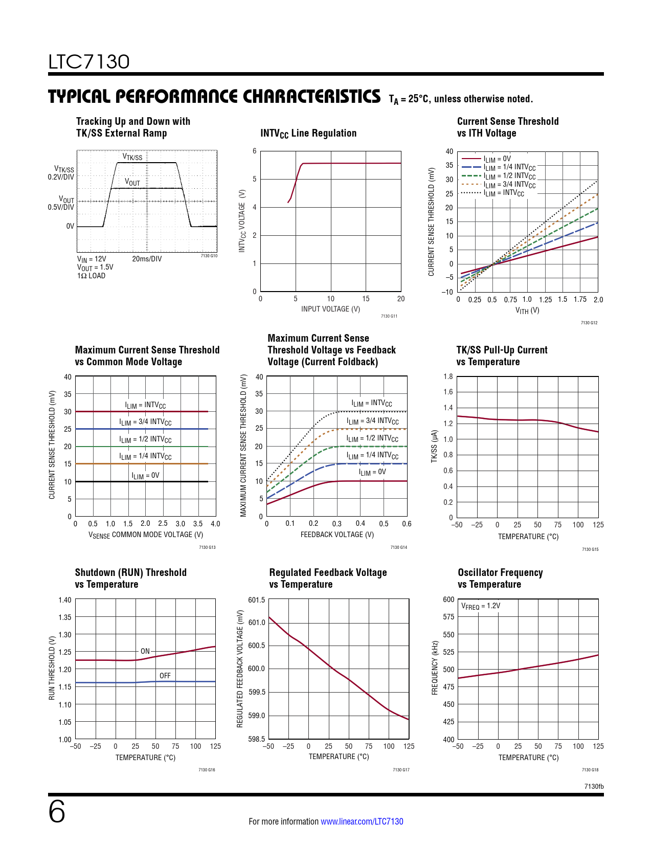 40 40 1.8 35 35 1.6 ILIM = INTVCC ILIM = INTVCC 30 30 1.4 ILIM = 3/4 INTVCC ILIM = 3/4 INTVCC 1.2 25 25 ILIM = 1/2 INTVCC ILIM = 1/2 INTVCC 1.0 20 20 ILIM = 1/4 INTVCC ILIM = 1/4 INTVCC 0.8 15 15 TK/SS (µA) 0.6 I ILIM = 0V 10 LIM = 0V 10 0.4 CURRENT SENSE THRESHOLD (mV) 5 5 0.2 0 MAXIMUM CURRENT SENSE THRESHOLD (mV) 0 0 0 0.5 1.0 1.5 2.0 2.5 3.0 3.5 4.0 0 0.1 0.2 0.3 0.4 0.5 0.6 –50 –25 0 25 50 75 100 125 VSENSE COMMON MODE VOLTAGE (V) FEEDBACK VOLTAGE (V) TEMPERATURE (°C) 7130 G13 7130 G14 7130 G15