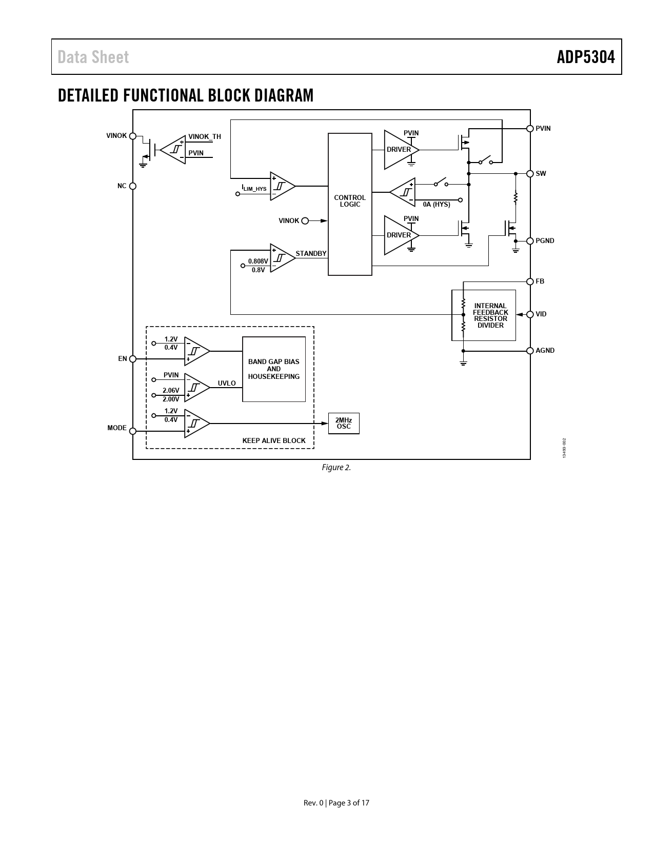 Data Sheet ADP5304 DETAILED FUNCTIONAL BLOCK DIAGRAM PVIN VINOK PVIN VINOK_TH PVIN DRIVER SW NC ILIM_HYS CONTROL LOGIC 0A (HYS) PVIN VINOK DRIVER PGND STANDBY 0.808V 0.8V FB INTERNAL FEEDBACK VID RESISTOR DIVIDER 1.2V 0.4V AGND EN BAND GAP BIAS AND PVIN HOUSEKEEPING UVLO 2.06V 2.00V 1.2V 0.4V 2MHz MODE OSC KEEP ALIVE BLOCK