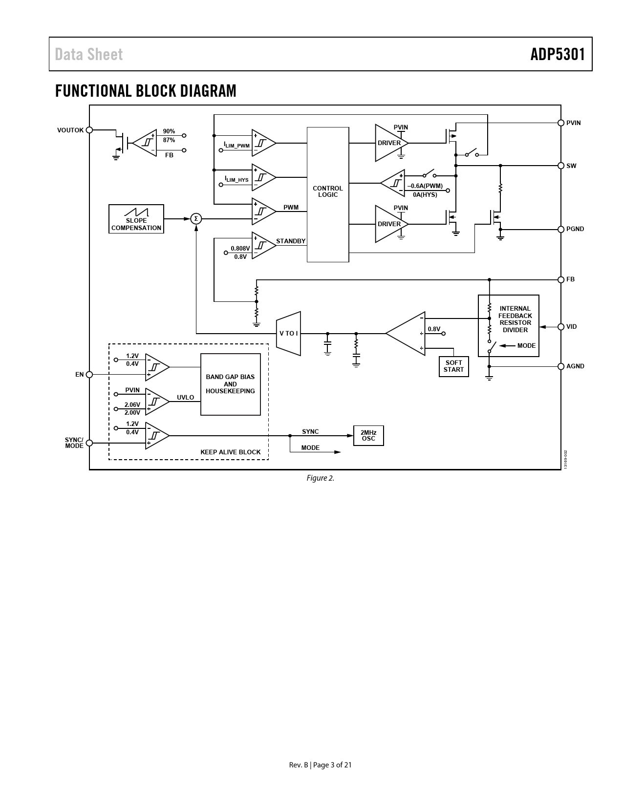 Data Sheet ADP5301 FUNCTIONAL BLOCK DIAGRAM PVIN VOUTOK PVIN 90% 87% I DRIVER LIM_PWM FB SW ILIM_HYS CONTROL –0.6A(PWM) LOGIC 0A(HYS) PWM PVIN Σ SLOPE DRIVER COMPENSATION PGND STANDBY 0.808V 0.8V FB INTERNAL FEEDBACK RESISTOR 0.8V DIVIDER VID V TO I MODE 1.2V 0.4V SOFT AGND START EN BAND GAP BIAS AND PVIN HOUSEKEEPING UVLO 2.06V 2.00V 1.2V 0.4V SYNC 2MHz SYNC/ OSC MODE MODE