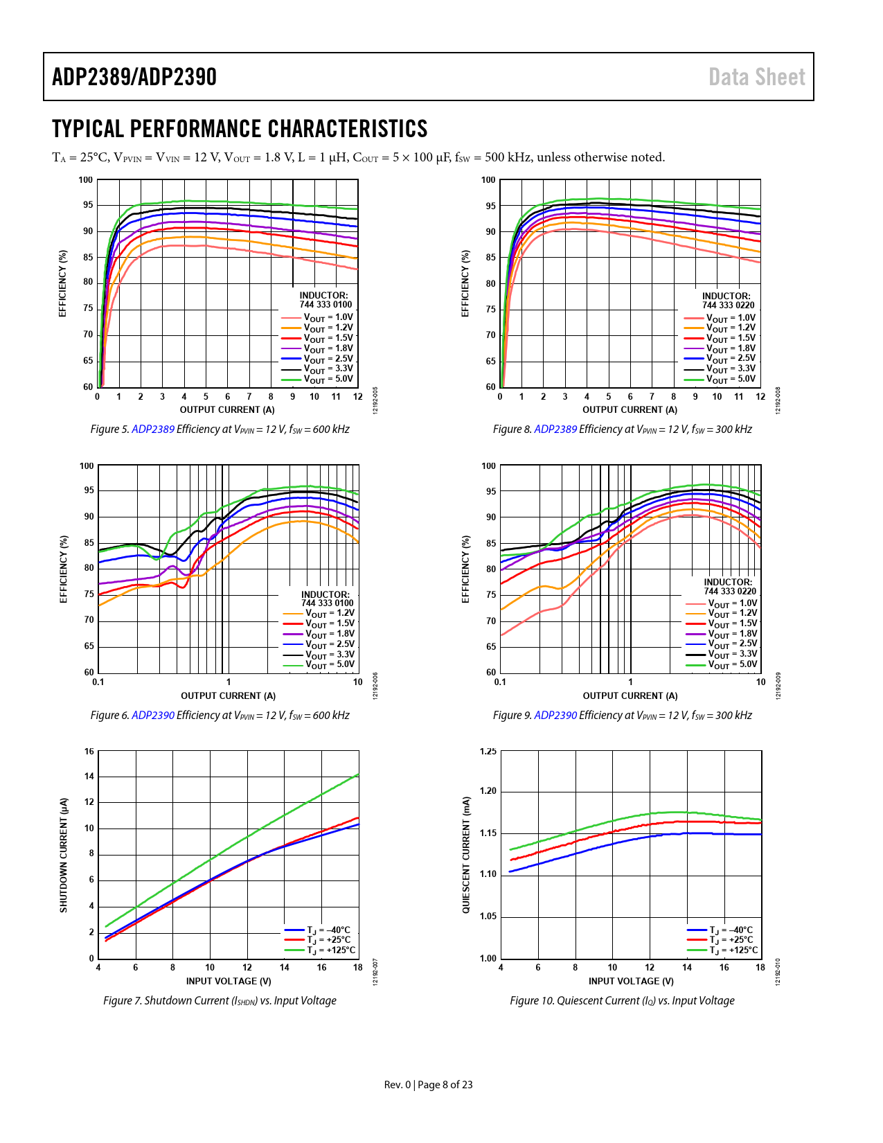 ADP2389/ADP2390. Data Sheet. TYPICAL PERFORMANCE CHARACTERISTICS. 100. (%). ENCY. INDUCTOR:. 744 333 0100. 744 333 0220. EFFICI. OUT = 1.0V