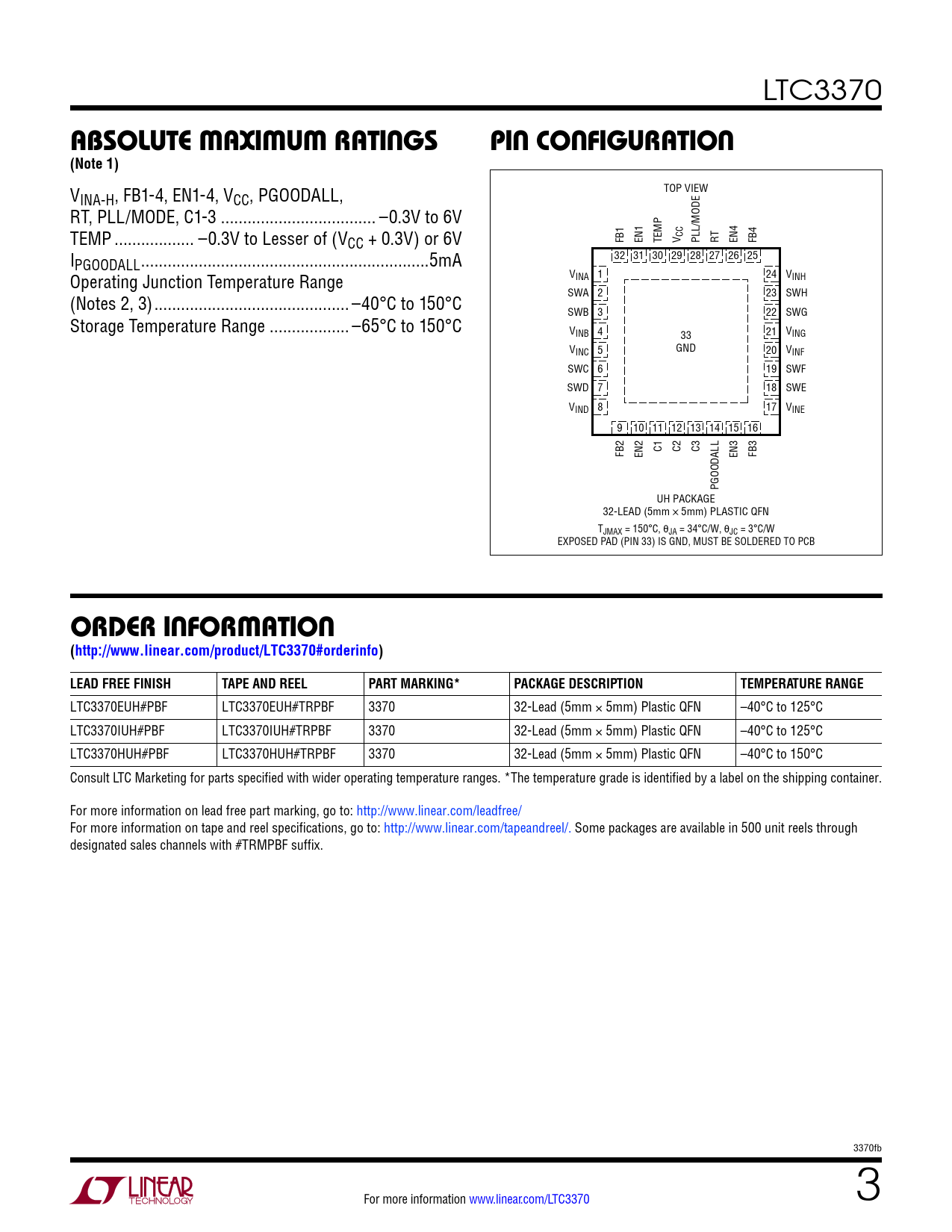 absoluTe MaxiMuM raTings pin conFiguraTion (Note 1) orDer inForMaTion (http://www.linear.com/product/LTC3370#orderinfo)