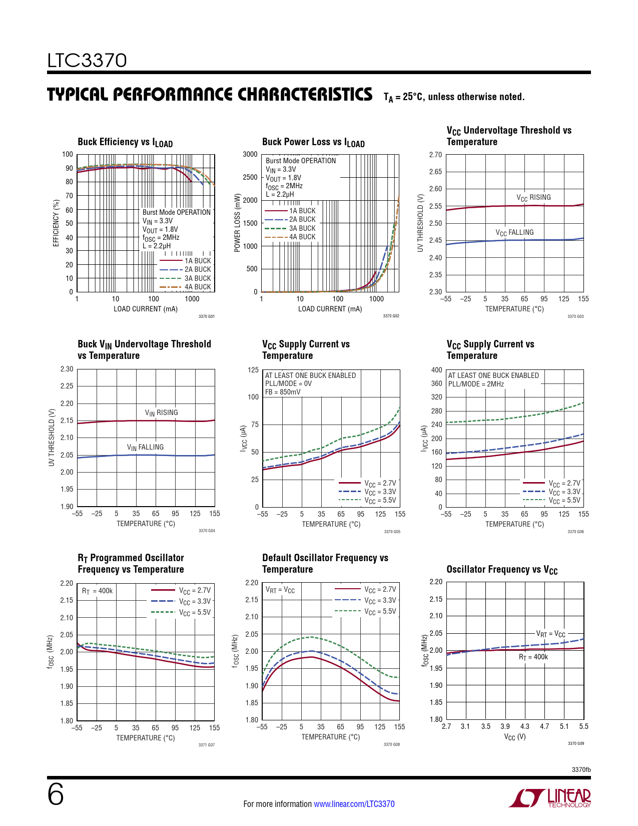 100 3000 2.70 Burst Mode OPERATION 90 VIN = 3.3V 2.65 2500 80 VOUT = 1.8V fOSC = 2MHz 2.60 70 L = 2.2µH 2000 VCC RISING 60 2.55 Burst Mode OPERATION 1A BUCK 50 VIN = 3.3V 1500 2A BUCK 2.50 VOUT = 1.8V 3A BUCK V 40 f CC FALLING OSC = 2MHz 4A BUCK EFFICIENCY (%) 2.45 L = 2.2µH 1000 30 POWER LOSS (mW) UV THRESHOLD (V) 2.40 20 1A BUCK 2A BUCK 500 10 3A BUCK 2.35 4A BUCK 0 0 2.30 1 10 100 1000 1 10 100 1000 –55 –25 5 35 65 95 125 155 LOAD CURRENT (mA) LOAD CURRENT (mA) TEMPERATURE (°C) 3370 G01 3370 G02 3370 G03