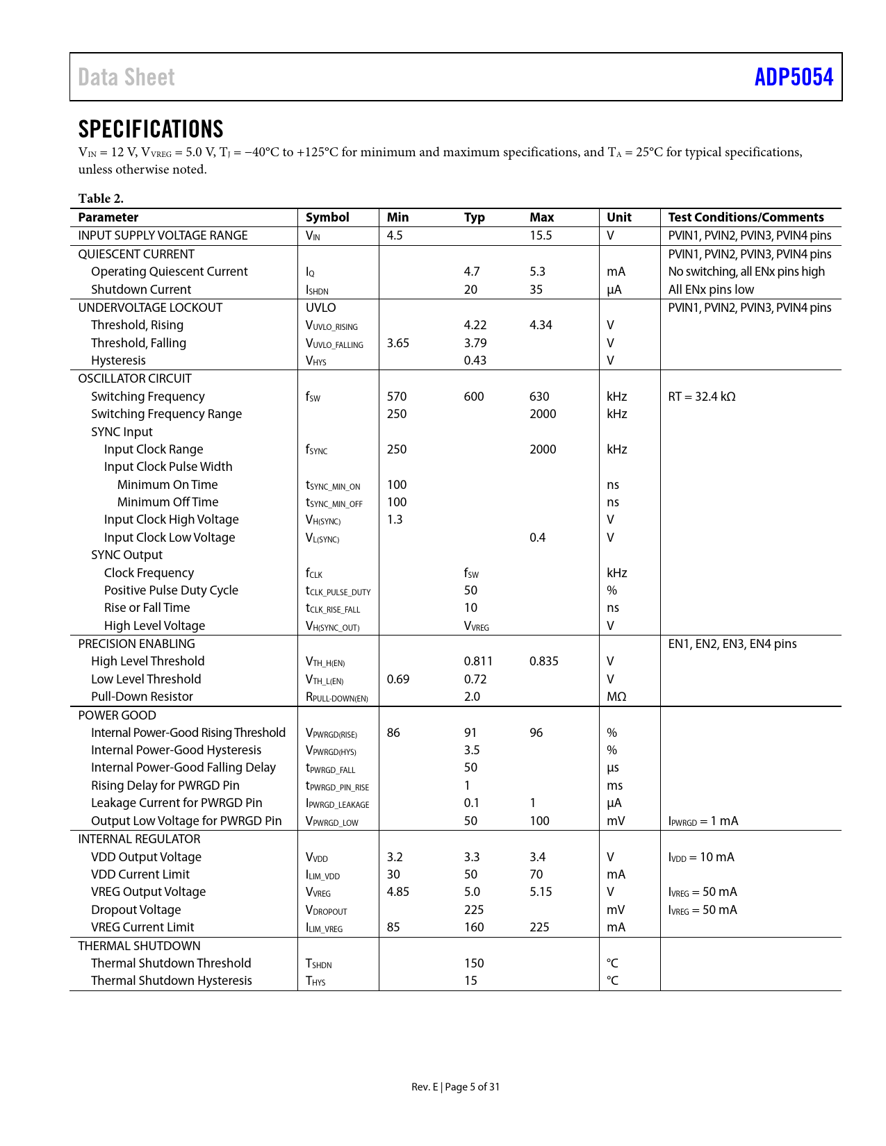Data Sheet. ADP5054. SPECIFICATIONS. Table 2. Parameter. Symbol. Min. Typ. Max. Unit. Test Conditions/Comments