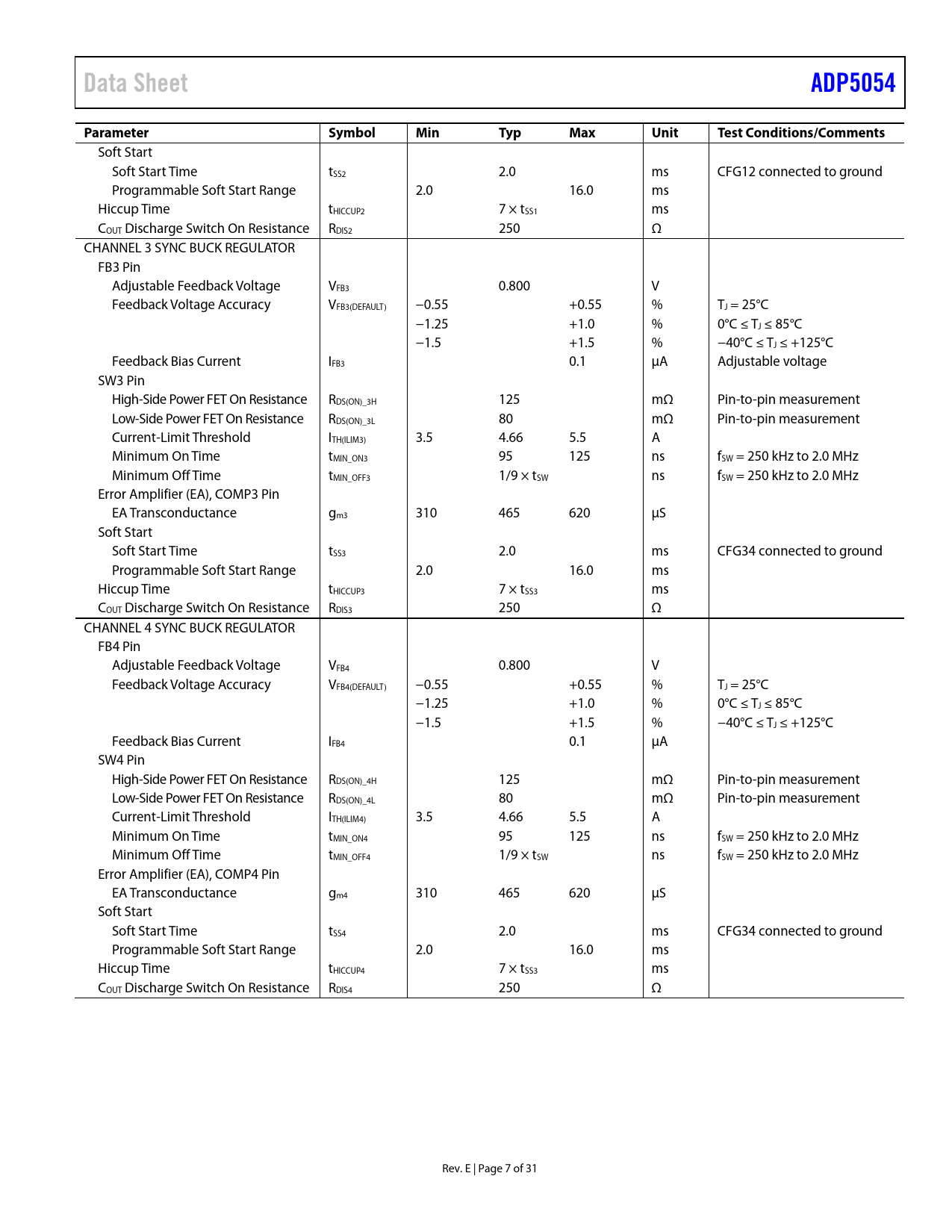 | Pages / Page | 31 / 7 — Data Sheet. ADP5054. Parameter. Symbol. Min. Typ. Max. Unit. Test … |