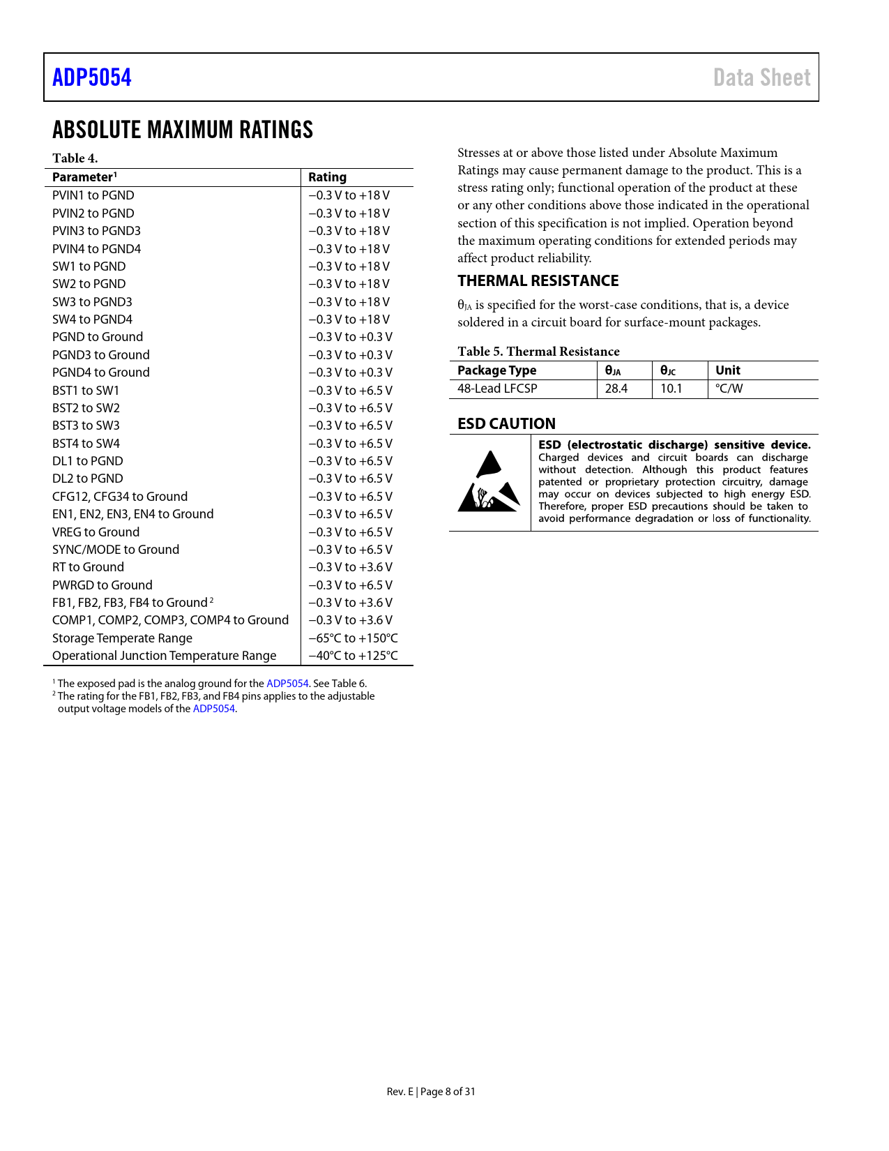 ADP5054. Data Sheet. ABSOLUTE MAXIMUM RATINGS Table 4. Parameter1. Rating. THERMAL RESISTANCE. Table 5. Thermal Resistance