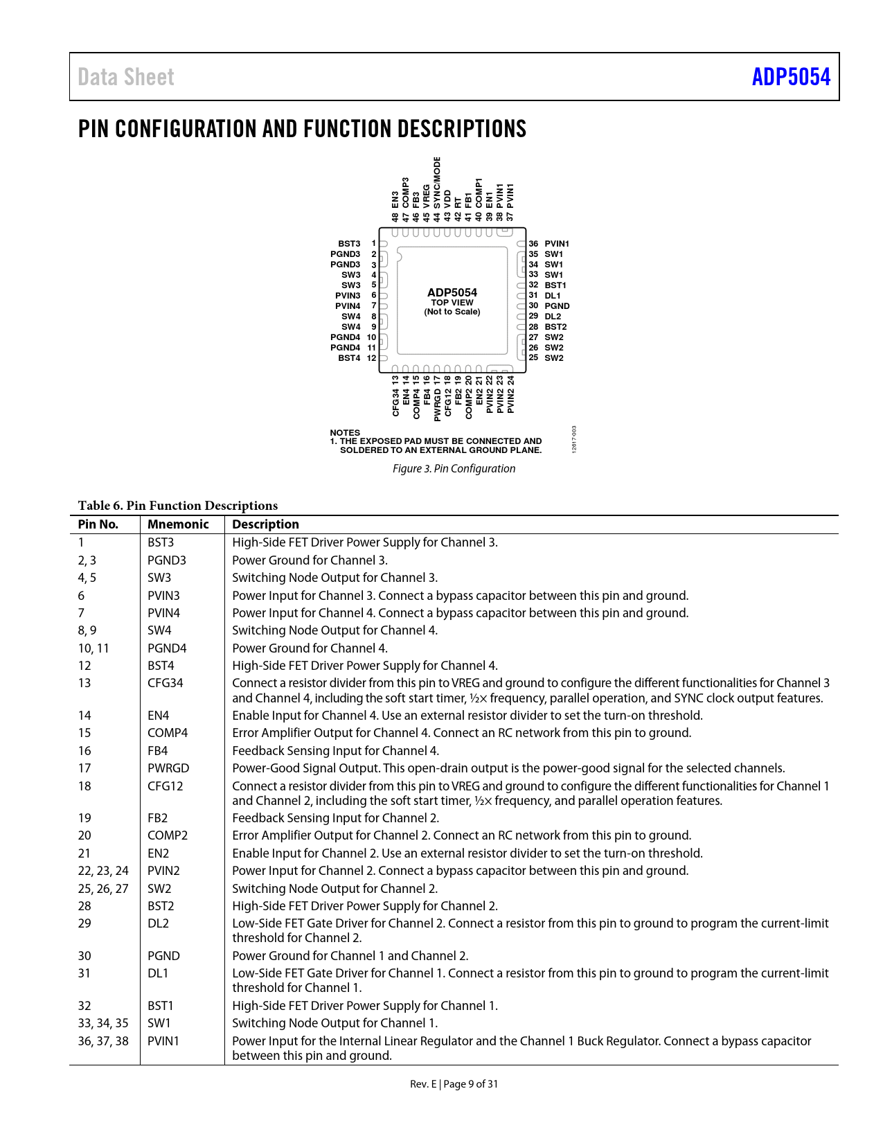Data SheetADP5054PIN CONFIGURATION AND FUNCTION DESCRIPTIONSDE O M11MP3EGNC/MP1NNN3OB3YDDB1ON1ECFVRSVRTFCEPVIPVI484746454443424140393837BST3136 PVIN1PGND3235 SW1PGND3334 SW1SW3433 SW1SW3532 BST1PVIN36ADP505431 DL1PVIN47TOP VIEW30 PGND(Not to Scale)SW4829 DL2SW4928 BST2PGND4 1027 SW2PGND4 1126 SW2BST4 1225 SW2131415161718192021222324D22234N4B412B2N2NNNGEMP4FGFRGMP2EOOPVIPVIPVICFWCFCCPNOTES 003 1. THE EXPOSED PAD MUST BE CONNECTED AND SOLDERED TO AN EXTERNAL GROUND PLANE. 12617- Figure 3. Pin Configuration Table 6. Pin Function Descriptions Pin No.MnemonicDescription 1 BST3 High-Side FET Driver Power Supply for Channel 3. 2, 3 PGND3 Power Ground for Channel 3. 4, 5 SW3 Switching Node Output for Channel 3. 6 PVIN3 Power Input for Channel 3. Connect a bypass capacitor between this pin and ground. 7 PVIN4 Power Input for Channel 4. Connect a bypass capacitor between this pin and ground. 8, 9 SW4 Switching Node Output for Channel 4. 10, 11 PGND4 Power Ground for Channel 4. 12 BST4 High-Side FET Driver Power Supply for Channel 4. 13 CFG34 Connect a resistor divider from this pin to VREG and ground to configure the different functionalities for Channel 3 and Channel 4, including the soft start timer, ½× frequency, parallel operation, and SYNC clock output features. 14 EN4 Enable Input for Channel 4. Use an external resistor divider to set the turn-on threshold. 15 COMP4 Error Amplifier Output for Channel 4. Connect an RC network from this pin to ground. 16 FB4 Feedback Sensing Input for Channel 4. 17 PWRGD Power-Good Signal Output. This open-drain output is the power-good signal for the selected channels. 18 CFG12 Connect a resistor divider from this pin to VREG and ground to configure the different functionalities for Channel 1 and Channel 2, including the soft start timer, ½× frequency, and parallel operation features. 19 FB2 Feedback Sensing Input for Channel 2. 20 COMP2 Error Amplifier Output for Channel 2. Connect an RC network from this pin to ground. 21 EN2 Enable Input for Channel 2. Use an external resistor divider to set the turn-on threshold. 22, 23, 24 PVIN2 Power Input for Channel 2. Connect a bypass capacitor between this pin and ground. 25, 26, 27 SW2 Switching Node Output for Channel 2. 28 BST2 High-Side FET Driver Power Supply for Channel 2. 29 DL2 Low-Side FET Gate Driver for Channel 2. Connect a resistor from this pin to ground to program the current-limit threshold for Channel 2. 30 PGND Power Ground for Channel 1 and Channel 2. 31 DL1 Low-Side FET Gate Driver for Channel 1. Connect a resistor from this pin to ground to program the current-limit threshold for Channel 1. 32 BST1 High-Side FET Driver Power Supply for Channel 1. 33, 34, 35 SW1 Switching Node Output for Channel 1. 36, 37, 38 PVIN1 Power Input for the Internal Linear Regulator and the Channel 1 Buck Regulator. Connect a bypass capacitor between this pin and ground. Rev. E | Page 9 of 31 Document Outline Features Applications Typical Application Circuit General Description Revision History Detailed Functional Block Diagram Specifications Buck Regulator Specifications Absolute Maximum Ratings Thermal Resistance ESD Caution Pin Configuration and Function Descriptions Typical Performance Characteristics Theory of Operation Buck Regulator Operational Modes PWM Mode PSM Mode Forced PWM and Automatic PWM/PSM Modes Adjustable and Fixed Output Voltage Internal Regulators (VREG and VDD) Separate Supply Applications Low-Side Device Selection Bootstrap Circuitry Active Output Discharge Switch Precision Enabling Oscillator Phase Shift Synchronization Input/Output Soft Start Parallel Operation Startup with Precharged Output Current-Limit Protection Frequency Foldback Pulse Skip in Maximum Duty Short-Circuit Protection (SCP) Latch-Off Protection Short-Circuit Latch-Off Mode Undervoltage Lockout (UVLO) Power-Good Function Thermal Shutdown Applications Information ADIsimPower Design Tool Programming the Output Voltage Voltage Conversion Limitations Current-Limit Setting Soft Start Setting Inductor Selection Output Capacitor Selection Input Capacitor Selection Low-Side Power Device Selection Programming the UVLO Input Compensation Components Design Power Dissipation Buck Regulator Power Dissipation Power Switch Conduction Loss (PCOND) Switching Loss (PSW) Transition Loss (PTRAN) Thermal Shutdown Junction Temperature Design Examples Setting the Switching Frequency Setting the Output Voltage Setting the Current Limit Selecting the Inductor Selecting the Output Capacitor Selecting the Low-Side MOSFET Designing the Compensation Network Selecting the Soft Start Time Selecting the Input Capacitor Printed Circuit Board Layout Recommendations Typical Application Circuit Factory Default Options Outline Dimensions Ordering Guide