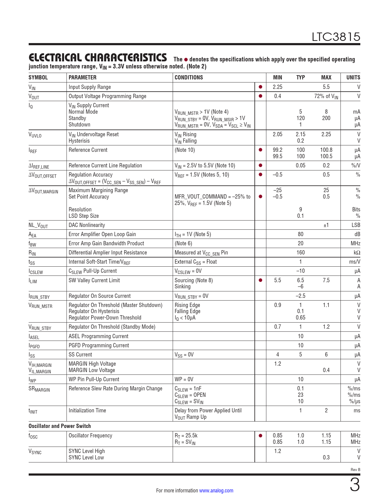 VIN Input Supply Range l 2.25 5.5 V VOUT Output Voltage Programming Range l 0.4 72% of VIN V IQ VIN Supply Current Normal Mode VRUN_MSTR > 1V (Note 4) 5 8 mA Standby VRUN_STBY = 0V, VRUN_MSIR > 1V 120 200 µA Shutdown VRUN_MSTR = 0V, VSDA = VSCL ≥ VIN 1 µA VUVLO VIN Undervoltage Reset VIN Rising 2.05 2.15 2.25 V Hysterisis VIN Falling 0.2 V IREF Reference Current (Note 10) l 99.2 100 100.8 µA 99.5 100 100.5 µA ΔIREF,LINE Reference Current Line Regulation VIN = 2.5V to 5.5V (Note 10) l 0.05 0.2 %/V ΔVOUT,OFFSET Regulation Accuracy VREF = 1.5V (Notes 5, 10) l –0.5 0.5 % ΔVOUT,OFFSET = (VCC_SEN – VSS_SEN) – VREF ΔVOUT,MARGIN Maximum Margining Range –25 25 % Set Point Accuracy MFR_VOUT_COMMAND = –25% to l –0.5 0.5 % 25%, VREF = 1.5V (Note 5) Resolution 9 Bits LSD Step Size 0.1 % NL_VOUT DAC Nonlinearity ±1 LSB AEA Error Amplifier Open Loop Gain ITH = 1V (Note 5) 80 dB fBW Error Amp Gain Bandwidth Product (Note 6) 20 MHz RIN Differential Amplier Input Resistance Measured at VCC_SEN Pin 160 kΩ tSS Internal Soft-Start Time/VREF External CSS = Float 1 ms/V ICSLEW CSLEW Pull-Up Current VCSLEW = 0V –10 µA ILIM SW Valley Current Limit Sourcing (Note 8) l 5.5 6.5 7.5 A Sinking –6 A IRUN_STBY Regulator On Source Current VRUN_STBY = 0V –2.5 µA VRUN_MSTR Regulator On Threshold (Master Shutdown) Rising Edge 0.9 1 1.1 V Regulator On Hysterisis Falling Edge 0.1 V Regulator Power-Down Threshold IQ < 10μA 0.65 V VRUN_STBY Regulator On Threshold (Standby Mode) 0.7 1 1.2 V IASEL ASEL Programming Current 10 µA IPGFD PGFD Programming Current 10 µA ISS SS Current VSS = 0V 4 5 6 µA VIH,MARGIN MARGIN High Voltage 1.2 V VIL,MARGIN MARGIN Low Voltage 0.4 V IWP WP Pin Pull-Up Current WP = 0V 10 µA SRMARGIN Reference Slew Rate During Margin Change CSLEW = 1nF 0.1 %/ms CSLEW = OPEN 23 %/ms CSLEW = SVIN 10 %/µs tINIT Initialization Time Delay from Power Applied Until 1 2 ms VOUT Ramp Up
