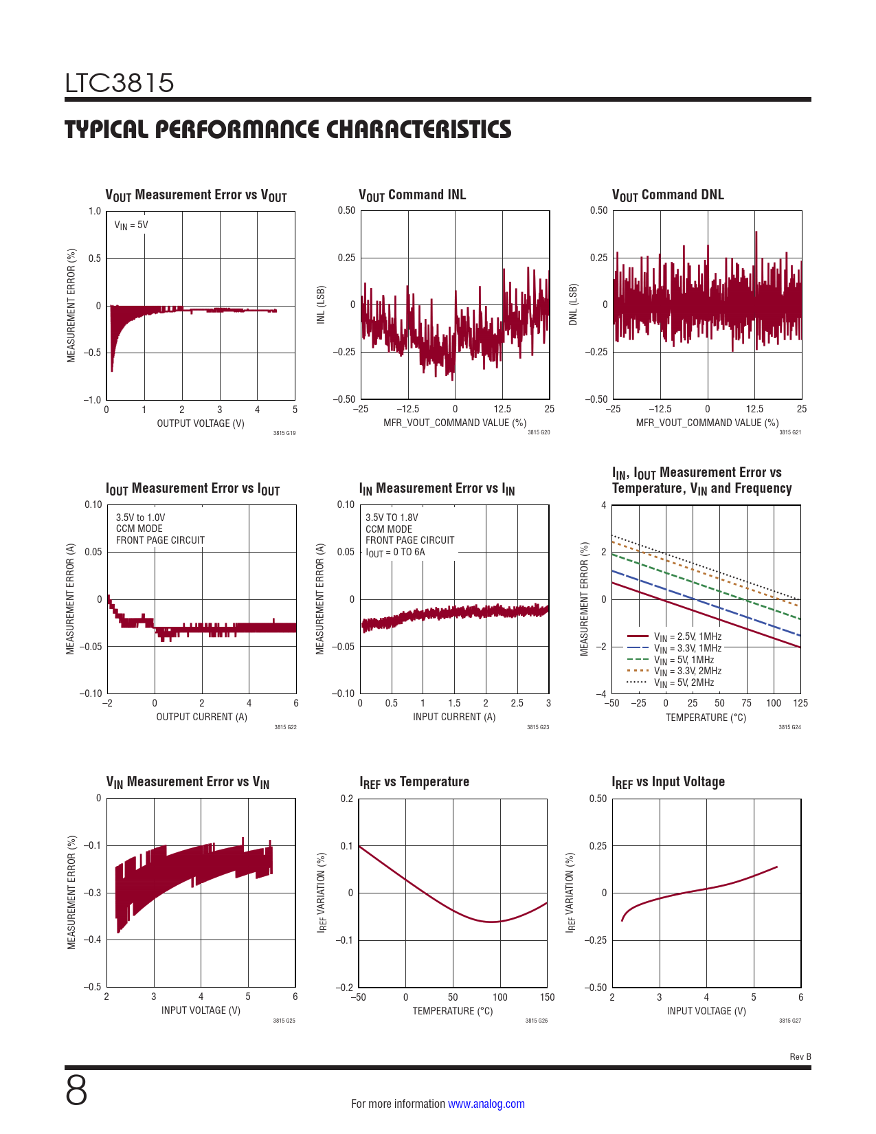 1.0 0.50 0.50 VIN = 5V 0.5 0.25 0.25 0 0 0 INL (LSB) DNL (LSB) –0.5 –0.25 –0.25 MEASUREMENT ERROR (%) –1.0 –0.50 –0.50 0 1 2 3 4 5 –25 –12.5 0 12.5 25 –25 –12.5 0 12.5 25 OUTPUT VOLTAGE (V) MFR_VOUT_COMMAND VALUE (%) MFR_VOUT_COMMAND VALUE (%) 3815 G19 3815 G20 3815 G21