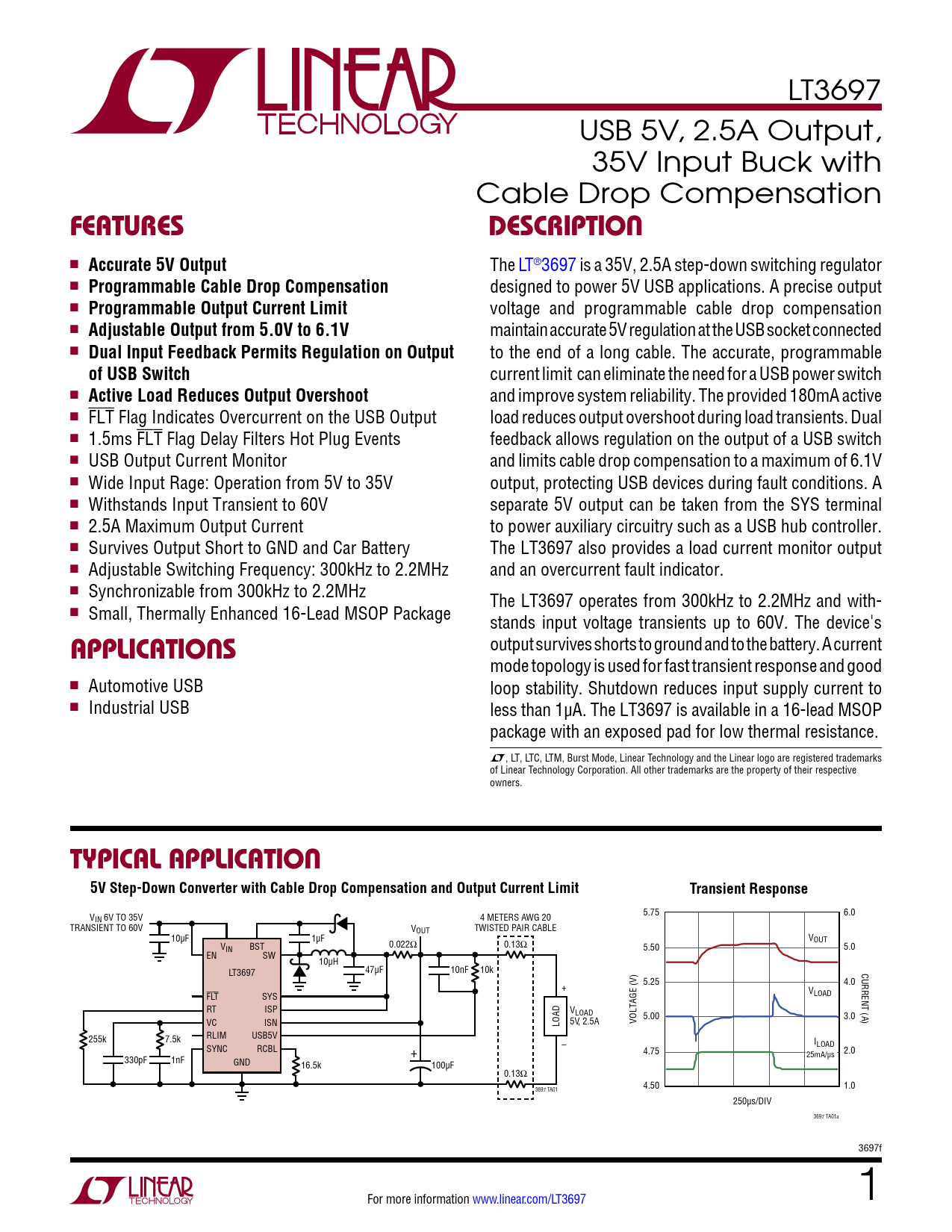 and improve system reliability. The provided 180mA active n FLT Flag Indicates Overcurrent on the USB Output load reduces output overshoot during load transients. Dual n 1.5ms FLT Flag Delay Filters Hot Plug Events feedback allows regulation on the output of a USB switch n USB Output Current Monitor and limits cable drop compensation to a maximum of 6.1V n Wide Input Rage: Operation from 5V to 35V output, protecting USB devices during fault conditions. A n Withstands Input Transient to 60V separate 5V output can be taken from the SYS terminal n 2.5A Maximum Output Current to power auxiliary circuitry such as a USB hub controller. n Survives Output Short to GND and Car Battery The LT3697 also provides a load current monitor output n Adjustable Switching Frequency: 300kHz to 2.2MHz and an overcurrent fault indicator. n Synchronizable from 300kHz to 2.2MHz The LT3697 operates from 300kHz to 2.2MHz and with- n Small, Thermally Enhanced 16-Lead MSOP Package stands input voltage transients up to 60V. The device's output survives shorts to ground and to the battery. A current