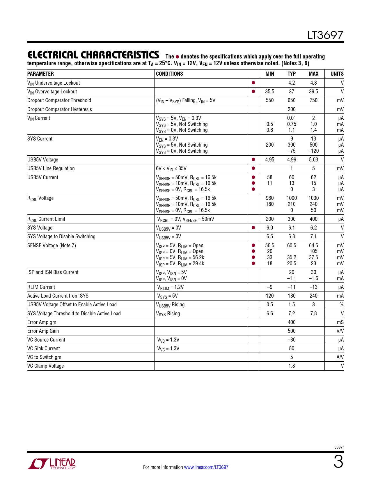 VIN Undervoltage Lockout l 4.2 4.8 V VIN Overvoltage Lockout l 35.5 37 39.5 V Dropout Comparator Threshold (VIN – VSYS) Falling, VIN = 5V 550 650 750 mV Dropout Comparator Hysteresis 200 mV VIN Current VSYS = 5V, VEN = 0.3V 0.01 2 μA VSYS = 5V, Not Switching 0.5 0.75 1.0 mA VSYS = 0V, Not Switching 0.8 1.1 1.4 mA SYS Current VEN = 0.3V 9 13 μA VSYS = 5V, Not Switching 200 300 500 μA VSYS = 0V, Not Switching –75 –120 μA USB5V Voltage l 4.95 4.99 5.03 V USB5V Line Regulation 6V < VIN < 35V l 1 5 mV USB5V Current VSENSE = 50mV, RCBL = 16.5k l 58 60 62 μA VSENSE = 10mV, RCBL = 16.5k l 11 13 15 μA VSENSE = 0V, RCBL = 16.5k l 0 3 μA RCBL Voltage VSENSE = 50mV, RCBL = 16.5k 960 1000 1030 mV VSENSE = 10mV, RCBL = 16.5k 180 210 240 mV VSENSE = 0V, RCBL = 16.5k 0 50 mV RCBL Current Limit VRCBL = 0V, VSENSE = 50mV 200 300 400 μA SYS Voltage VUSB5V = 0V l 6.0 6.1 6.2 V SYS Voltage to Disable Switching VUSB5V = 0V 6.5 6.8 7.1 V SENSE Voltage (Note 7) VISP = 5V, RLIM = Open l 56.5 60.5 64.5 mV VISP = 0V, RLIM = Open l 20 105 mV VISP = 5V, RLIM = 56.2k l 33 35.2 37.5 mV VISP = 5V, RLIM = 29.4k l 18 20.5 23 mV ISP and ISN Bias Current VISP, VISN = 5V 20 30 μA VISP, VISN = 0V –1.1 –1.6 mA RLIM Current VRLIM = 1.2V –9 –11 –13 μA Active Load Current from SYS VSYS = 5V 120 180 240 mA USB5V Voltage Offset to Enable Active Load VUSB5V Rising 0.5 1.5 3 % SYS Voltage Threshold to Disable Active Load VSYS Rising 6.6 7.2 7.8 V Error Amp gm 400 mS Error Amp Gain 500 V/V VC Source Current VVC = 1.3V –80 μA VC Sink Current VVC = 1.3V 80 μA VC to Switch gm 5 A/V VC Clamp Voltage 1.8 V 3697f 3 For more information www.linear.com/LT3697