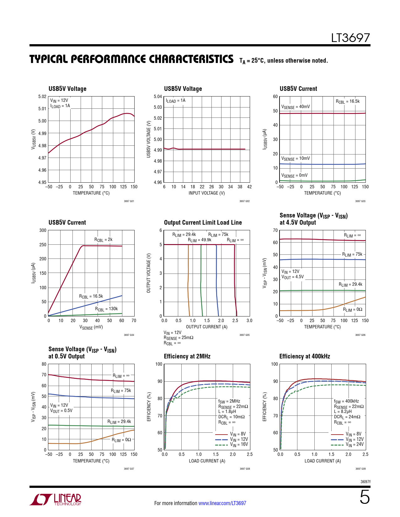 5.02 5.04 60 VIN = 12V ILOAD = 1A RCBL = 16.5k I 5.01 LOAD = 1A 5.03 VSENSE = 40mV 50 5.02 5.00 40 5.01 (V) 4.99 TAGE (V) (µA) 5.00 30 V USB5V 4.98 I USB5V 4.99 20 4.97 USB5V VOL VSENSE = 10mV 4.98 4.96 10 4.97 VSENSE = 0mV 4.95 4.96 0 –50 –25 0 25 50 75 100 125 150 6 10 14 18 22 26 30 34 38 42 –50 –25 0 25 50 75 100 125 150 TEMPERATURE (°C) INPUT VOLTAGE (V) TEMPERATURE (°C) 3697 G01 3697 G02 3697 G03