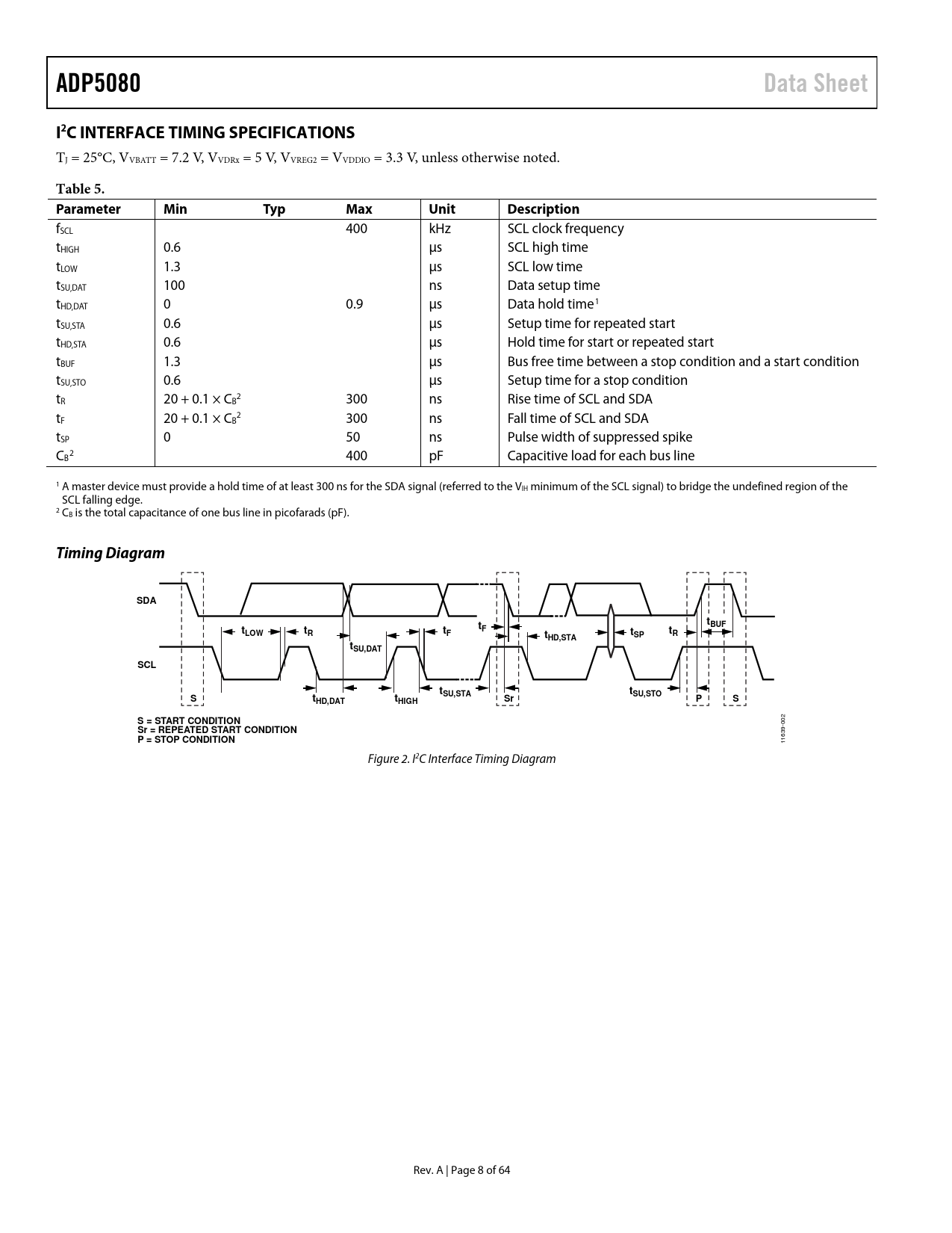 ADP5080. Data Sheet. I2C INTERFACE TIMING SPECIFICATIONS. Table 5. Parameter. Min. Typ. Max. Unit. Description. Timing Diagram. SDA. tBUF. tLOW