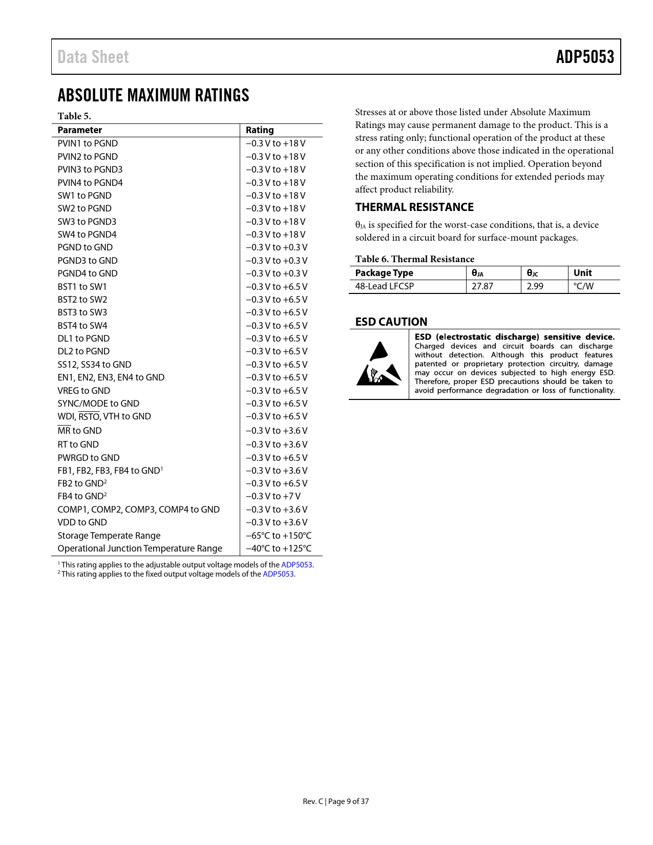 Data SheetADP5053ABSOLUTE MAXIMUM RATINGS Table 5. Stresses at or above those listed under Absolute Maximum ParameterRating Ratings may cause permanent damage to the product. This is a stress rating only; functional operation of the product at these PVIN1 to PGND −0.3 V to +18 V or any other conditions above those indicated in the operational PVIN2 to PGND −0.3 V to +18 V section of this specification is not implied. Operation beyond PVIN3 to PGND3 −0.3 V to +18 V the maximum operating conditions for extended periods may PVIN4 to PGND4 −0.3 V to +18 V affect product reliability. SW1 to PGND −0.3 V to +18 V SW2 to PGND −0.3 V to +18 V THERMAL RESISTANCE SW3 to PGND3 −0.3 V to +18 V θJA is specified for the worst-case conditions, that is, a device SW4 to PGND4 −0.3 V to +18 V soldered in a circuit board for surface-mount packages. PGND to GND −0.3 V to +0.3 V PGND3 to GND −0.3 V to +0.3 V Table 6. Thermal Resistance PGND4 to GND −0.3 V to +0.3 V Package TypeθJAθJCUnit BST1 to SW1 −0.3 V to +6.5 V 48-Lead LFCSP 27.87 2.99 °C/W BST2 to SW2 −0.3 V to +6.5 V BST3 to SW3 −0.3 V to +6.5 V BST4 to SW4 −0.3 V to +6.5 V ESD CAUTION DL1 to PGND −0.3 V to +6.5 V DL2 to PGND −0.3 V to +6.5 V SS12, SS34 to GND −0.3 V to +6.5 V EN1, EN2, EN3, EN4 to GND −0.3 V to +6.5 V VREG to GND −0.3 V to +6.5 V SYNC/MODE to GND −0.3 V to +6.5 V WDI, RSTO, VTH to GND −0.3 V to +6.5 V MR to GND −0.3 V to +3.6 V RT to GND −0.3 V to +3.6 V PWRGD to GND −0.3 V to +6.5 V FB1, FB2, FB3, FB4 to GND1 −0.3 V to +3.6 V FB2 to GND2 −0.3 V to +6.5 V FB4 to GND2 −0.3 V to +7 V COMP1, COMP2, COMP3, COMP4 to GND −0.3 V to +3.6 V VDD to GND −0.3 V to +3.6 V Storage Temperate Range −65°C to +150°C Operational Junction Temperature Range −40°C to +125°C 1 This rating applies to the adjustable output voltage models of the ADP5053. 2 This rating applies to the fixed output voltage models of the ADP5053. Rev. C | Page 9 of 37 Document Outline FEATURES APPLICATIONS TYPICAL APPLICATION CIRCUIT GENERAL DESCRIPTION TABLE OF CONTENTS REVISION HISTORY DETAILED FUNCTIONAL BLOCK DIAGRAM SPECIFICATIONS BUCK REGULATOR SPECIFICATIONS SUPERVISORY SPECIFICATIONS ABSOLUTE MAXIMUM RATINGS THERMAL RESISTANCE ESD CAUTION PIN CONFIGURATION AND FUNCTION DESCRIPTIONS TYPICAL PERFORMANCE CHARACTERISTICS THEORY OF OPERATION BUCK REGULATOR OPERATIONAL MODES Pulse-Width Modulation (PWM) Mode Power Save Mode (PSM) Forced PWM and Automatic PWM/PSM Modes ADJUSTABLE AND FIXED OUTPUT VOLTAGES INTERNAL REGULATORS (VREG AND VDD) SEPARATE SUPPLY APPLICATIONS LOW-SIDE DEVICE SELECTION BOOTSTRAP CIRCUITRY ACTIVE OUTPUT DISCHARGE SWITCH PRECISION ENABLING OSCILLATOR Phase Shift SYNCHRONIZATION INPUT/OUTPUT SOFT START PARALLEL OPERATION STARTUP WITH PRECHARGED OUTPUT CURRENT-LIMIT PROTECTION FREQUENCY FOLDBACK Pulse Skip Mode Under Maximum Duty Cycle HICCUP PROTECTION LATCH-OFF PROTECTION Short-Circuit Latch-Off Mode Overvoltage Latch-Off Mode UNDERVOLTAGE LOCKOUT (UVLO) POWER-GOOD FUNCTION THERMAL SHUTDOWN SUPERVISORY CIRCUIT Reset Output Watchdog Input Manual Reset Input Processor Manual Reset Mode Power On/Off Switch Mode APPLICATIONS INFORMATION ADIsimPower DESIGN TOOL PROGRAMMING THE ADJUSTABLE OUTPUT VOLTAGE VOLTAGE CONVERSION LIMITATIONS CURRENT-LIMIT SETTING SOFT START SETTING INDUCTOR SELECTION OUTPUT CAPACITOR SELECTION INPUT CAPACITOR SELECTION LOW-SIDE POWER DEVICE SELECTION PROGRAMMING THE UVLO INPUT COMPENSATION COMPONENTS DESIGN POWER DISSIPATION Buck Regulator Power Dissipation Power Switch Conduction Loss (PCOND) Switching Loss (PSW) Transition Loss (PTRAN) Thermal Shutdown JUNCTION TEMPERATURE DESIGN EXAMPLE SETTING THE SWITCHING FREQUENCY SETTING THE OUTPUT VOLTAGE SETTING THE CURRENT LIMIT SELECTING THE INDUCTOR SELECTING THE OUTPUT CAPACITOR SELECTING THE LOW-SIDE MOSFET DESIGNING THE COMPENSATION NETWORK SELECTING THE SOFT START TIME SELECTING THE INPUT CAPACITOR RECOMMENDED EXTERNAL COMPONENTS CIRCUIT BOARD LAYOUT RECOMMENDATIONS TYPICAL APPLICATION CIRCUITS FACTORY DEFAULT OPTIONS OUTLINE DIMENSIONS ORDERING GUIDE