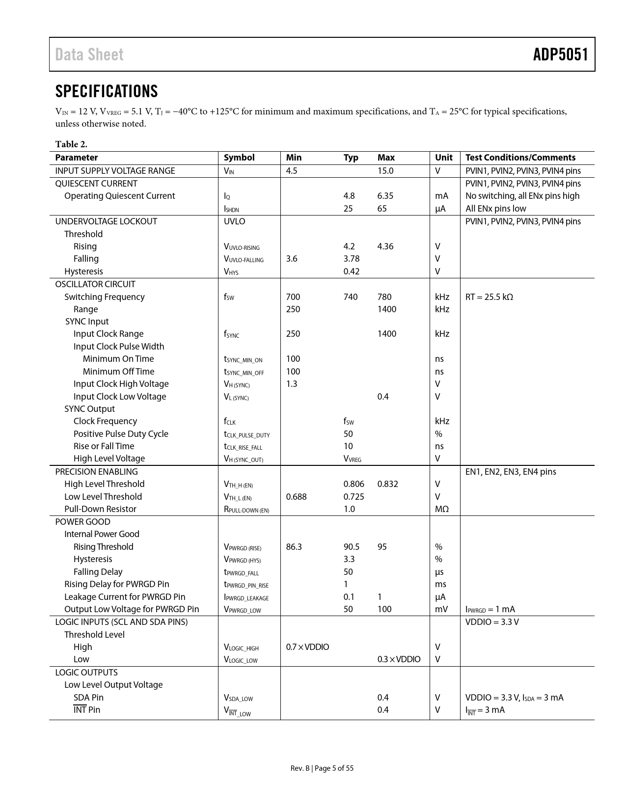 | Pages / Page | 55 / 5 — Data Sheet. ADP5051. SPECIFICATIONS. Table 2. Parameter. Symbol. Min. … |