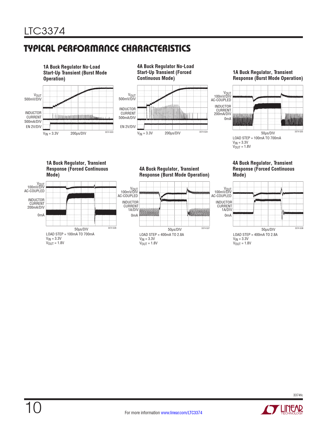 V VOUT OUT VOUT 100mV/DIV 500mV/DIV 500mV/DIV AC-COUPLED INDUCTOR INDUCTOR CURRENT INDUCTOR CURRENT 200mA/DIV CURRENT 500mA/DIV 0mA 500mA/DIV EN 2V/DIV EN 2V/DIV V 3374 G33 3374 G34 3374 G35 IN = 3.3V 200µs/DIV VIN = 3.3V 200µs/DIV 50µs/DIV LOAD STEP = 100mA TO 700mA VIN = 3.3V VOUT = 1.8V