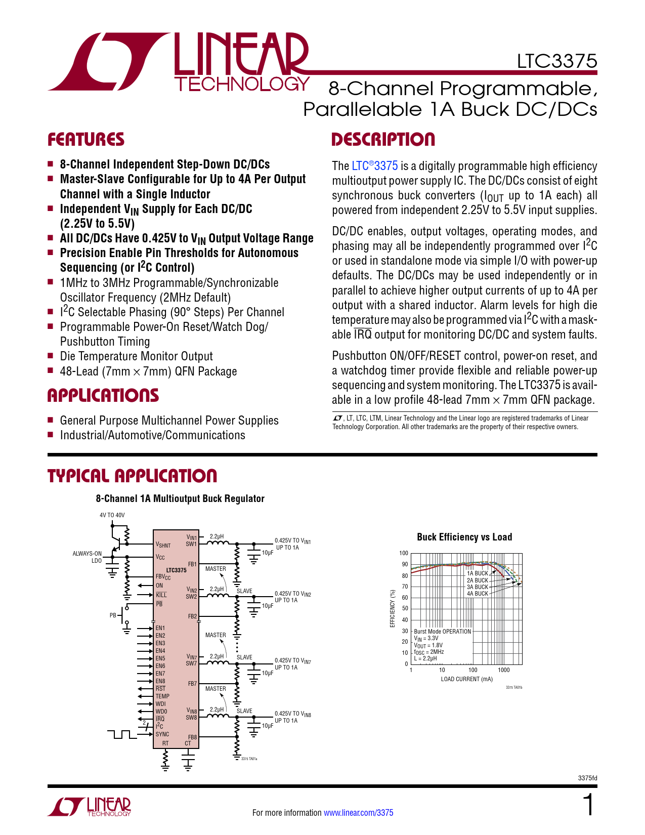 LTC3375 8-Channel Programmable, Parallelable 1A Buck DC/DCs FeaTuresDescripTion n 8-Channel Independent Step-Down DC/DCs The LTC®3375 is a digitally programmable high efficiency n Master-Slave Configurable for Up to 4A Per Output multioutput power supply IC. The DC/DCs consist of eight Channel with a Single Inductor synchronous buck converters (IOUT up to 1A each) all n Independent VIN Supply for Each DC/DC powered from independent 2.25V to 5.5V input supplies. (2.25V to 5.5V) DC/DC enables, output voltages, operating modes, and n All DC/DCs Have 0.425V to VIN Output Voltage Range phasing may all be independently programmed over I2C n Precision Enable Pin Thresholds for Autonomous or used in standalone mode via simple I/O with power-up Sequencing (or I2C Control) defaults. The DC/DCs may be used independently or in n 1MHz to 3MHz Programmable/Synchronizable parallel to achieve higher output currents of up to 4A per Oscillator Frequency (2MHz Default) output with a shared inductor. Alarm levels for high die n I2C Selectable Phasing (90° Steps) Per Channel temperature may also be programmed via I2C with a mask- n Programmable Power-On Reset/Watch Dog/ able IRQ output for monitoring DC/DC and system faults. Pushbutton Timing n Die Temperature Monitor Output Pushbutton ON/OFF/RESET control, power-on reset, and n 48-Lead (7mm × 7mm) QFN Package a watchdog timer provide flexible and reliable power-up sequencing and system monitoring. The LTC3375 is avail- applicaTions able in a low profile 48-lead 7mm × 7mm QFN package. n General Purpose Multichannel Power Supplies L, LT, LTC, LTM, Linear Technology and the Linear logo are registered trademarks of Linear Technology Corporation. All other trademarks are the property of their respective owners. n Industrial/Automotive/Communications Typical applicaTion8-Channel 1A Multioutput Buck Regulator 4V TO 40V VIN1 2.2µH 0.425V TO V Buck Efficiency vs Load IN1 VSHNT SW1 UP TO 1A ALWAYS-ON 10µF V 100 CC LDO FB1 90 LTC3375 MASTER FBV 1A BUCK CC 80 2A BUCK ON V 70 3A BUCK IN2 2.2µH SLAVE KILL SW2 0.425V TO VIN2 4A BUCK UP TO 1A 60 PB 10µF 50 PB FB2 40 EN1 EFFICIENCY (%) 30 Burst Mode OPERATION EN2 MASTER V EN3 IN = 3.3V • 20 VOUT = 1.8V EN4 • • f V 10 OSC = 2MHz EN5 IN7 2.2µH SLAVE L = 2.2µH SW7 0.425V TO VIN7 EN6 UP TO 1A 0 EN7 10µF 1 10 100 1000 EN8 LOAD CURRENT (mA) FB7 RST MASTER 3375 TA01b TEMP WDI WD0 VIN8 2.2µH SLAVE 0.425V TO V SW8 IN8 IRQ 2 UP TO 1A I2C 10µF SYNC FB8 RT CT 3375 TA01a 3375fd For more information www.linear.com/3375 1 Document Outline Features Applications Description Typical Application Table of Contents Absolute Maximum Ratings Pin Configuration Order Information Electrical Characteristics Typical Performance Characteristics Pin Functions Block Diagram Operation Applications Information Typical Application Related Parts Features Applications Typical Application Description Absolute Maximum Ratings Order Information Pin Configuration Electrical Characteristics Typical Performance Characteristics Pin Functions Block Diagram Operation Buck Switching Regulators Buck Regulators with Combined Power Stages Pushbutton Interface Power-Up and Power-Down Via Pushbutton Power-Up and Power-Down Via Enable Pin or I2C I2C Interface I2C Bus Speed I2C Start and Stop Conditions I2C Byte Format I2C Acknowledge I2C Slave Address I2C Sub-Addressed Writing I2C Bus Write Operation I2C Bus Read Operation Error Condition Reporting Via RST and IRQ Pins Temperature Monitoring and Overtemperature Protection RESET_ALL Functionality Programming the Operating Frequency VCC Shunt Regulator Watchdog Timer Applications Information Buck Switching Regulator Output Voltage and Feedback Network Buck Regulators Combined Buck Regulators VCC Shunt Regulator Input and Output Decoupling Capacitor Selection Choosing the CT Capacitor Programming the Global Register Programming the RST and IRQ Mask Registers Status Byte Read Back Typical Applications Package Description Typical Application Related Parts