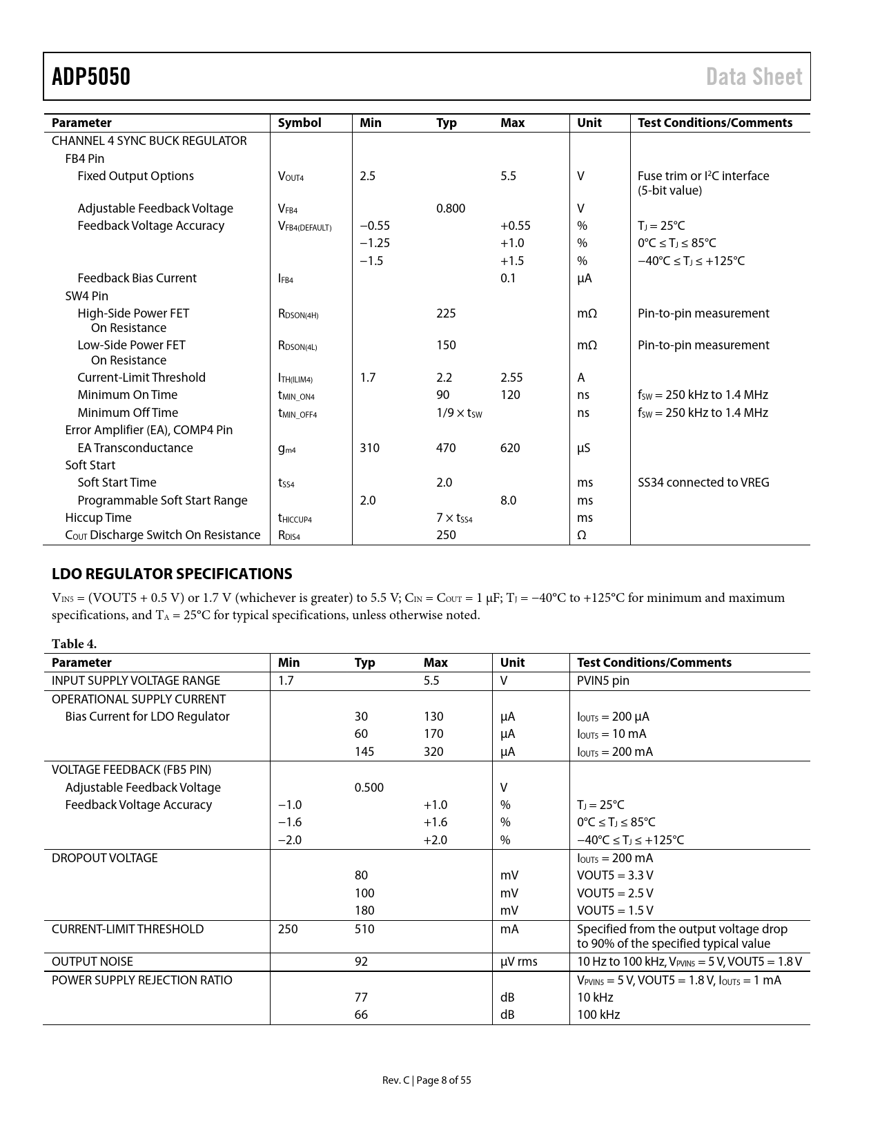 ADP5050. Data Sheet. Parameter. Symbol. Min. Typ. Max. Unit. Test Conditions/Comments. LDO REGULATOR SPECIFICATIONS. Table 4. Parameter