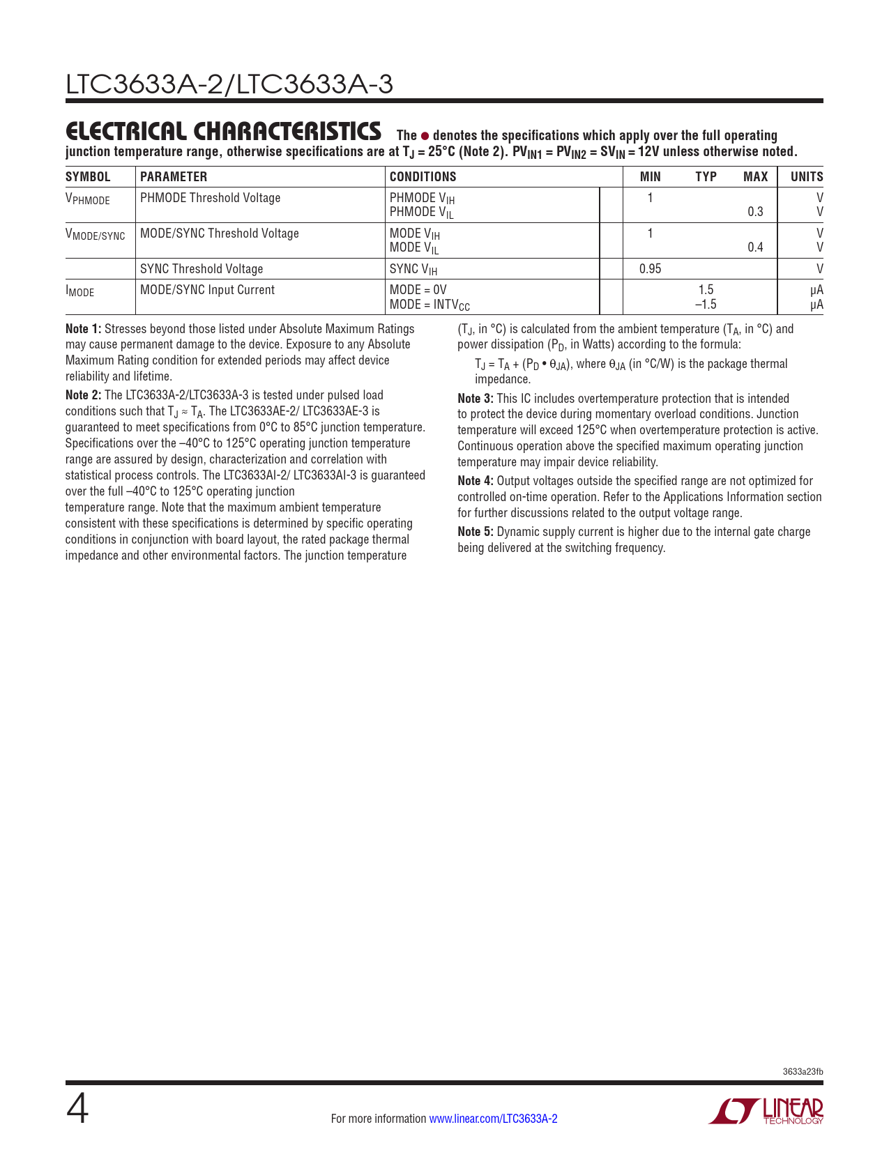 LTC3633A-2/LTC3633A-3 ELECTRICAL CHARACTERISTICS The l denotes the specifications which apply over the full operatingjunction temperature range, otherwise specifications are at TJ = 25°C (Note 2). PVIN1 = PVIN2 = SVIN = 12V unless otherwise noted. SYMBOLPARAMETERCONDITIONSMINTYPMAXUNITS VPHMODE PHMODE Threshold Voltage PHMODE VIH 1 V PHMODE VIL 0.3 V VMODE/SYNC MODE/SYNC Threshold Voltage MODE VIH 1 V MODE VIL 0.4 V SYNC Threshold Voltage SYNC VIH 0.95 V IMODE MODE/SYNC Input Current MODE = 0V 1.5 µA MODE = INTVCC –1.5 µA Note 1: Stresses beyond those listed under Absolute Maximum Ratings (TJ, in °C) is calculated from the ambient temperature (TA, in °C) and may cause permanent damage to the device. Exposure to any Absolute power dissipation (PD, in Watts) according to the formula: Maximum Rating condition for extended periods may affect device TJ = TA + (PD • θJA), where θJA (in °C/W) is the package thermal reliability and lifetime. impedance. Note 2: The LTC3633A-2/LTC3633A-3 is tested under pulsed load Note 3: This IC includes overtemperature protection that is intended conditions such that TJ ≈ TA. The LTC3633AE-2/ LTC3633AE-3 is to protect the device during momentary overload conditions. Junction guaranteed to meet specifications from 0°C to 85°C junction temperature. temperature will exceed 125°C when overtemperature protection is active. Specifications over the –40°C to 125°C operating junction temperature Continuous operation above the specified maximum operating junction range are assured by design, characterization and correlation with temperature may impair device reliability. statistical process controls. The LTC3633AI-2/ LTC3633AI-3 is guaranteed Note 4: Output voltages outside the specified range are not optimized for over the full –40°C to 125°C operating junction controlled on-time operation. Refer to the Applications Information section temperature range. Note that the maximum ambient temperature for further discussions related to the output voltage range. consistent with these specifications is determined by specific operating conditions in conjunction with board layout, the rated package thermal Note 5: Dynamic supply current is higher due to the internal gate charge impedance and other environmental factors. The junction temperature being delivered at the switching frequency. 3633a23fb 4 For more information www.linear.com/LTC3633A-2 Document Outline Description Typical Application Absolute Maximum Ratings Pin Configuration Electrical Characteristics Typical Performance Characteristics Pin Functions Operation Applications Information Package Description Typical Application Related Parts
